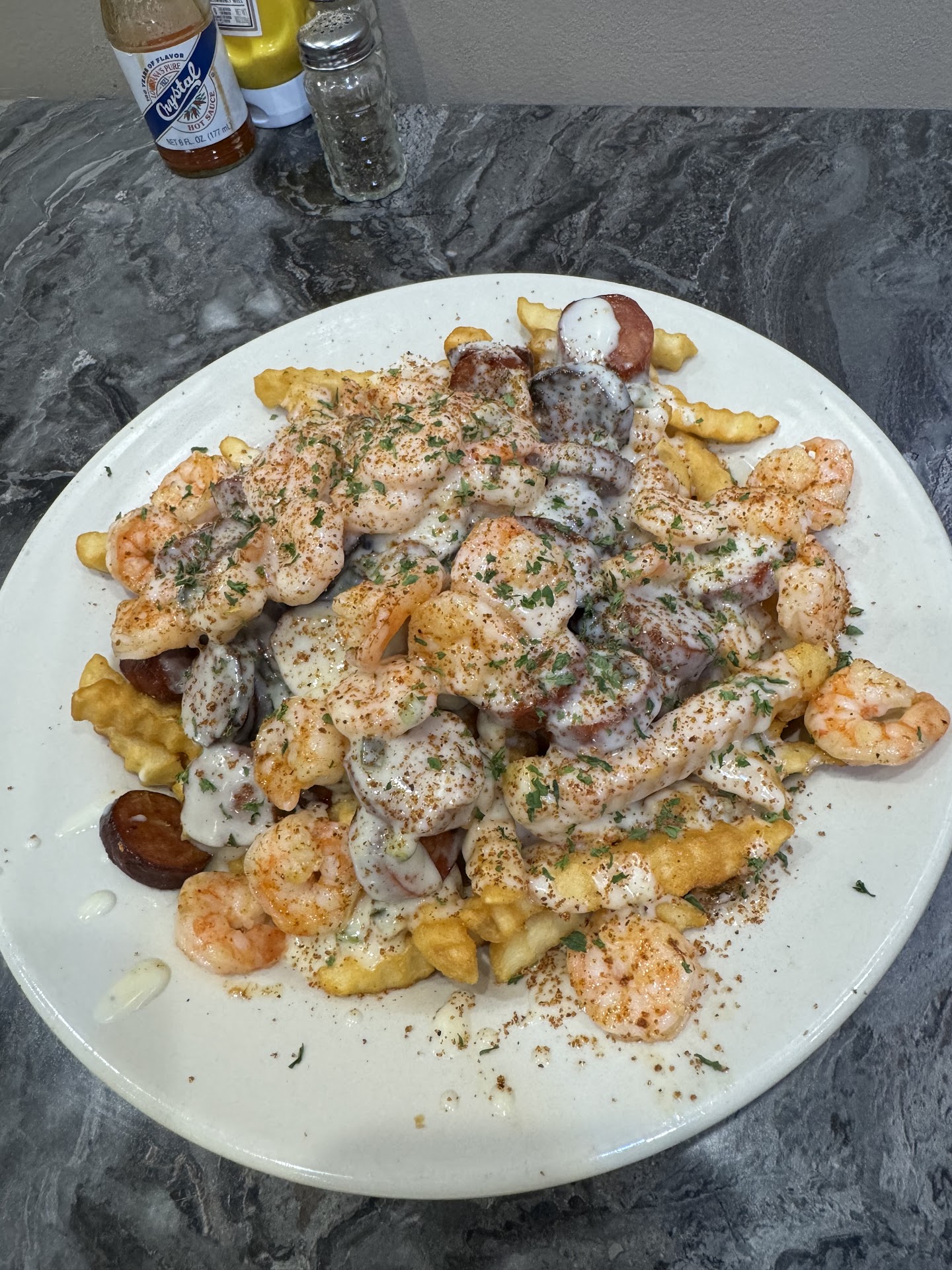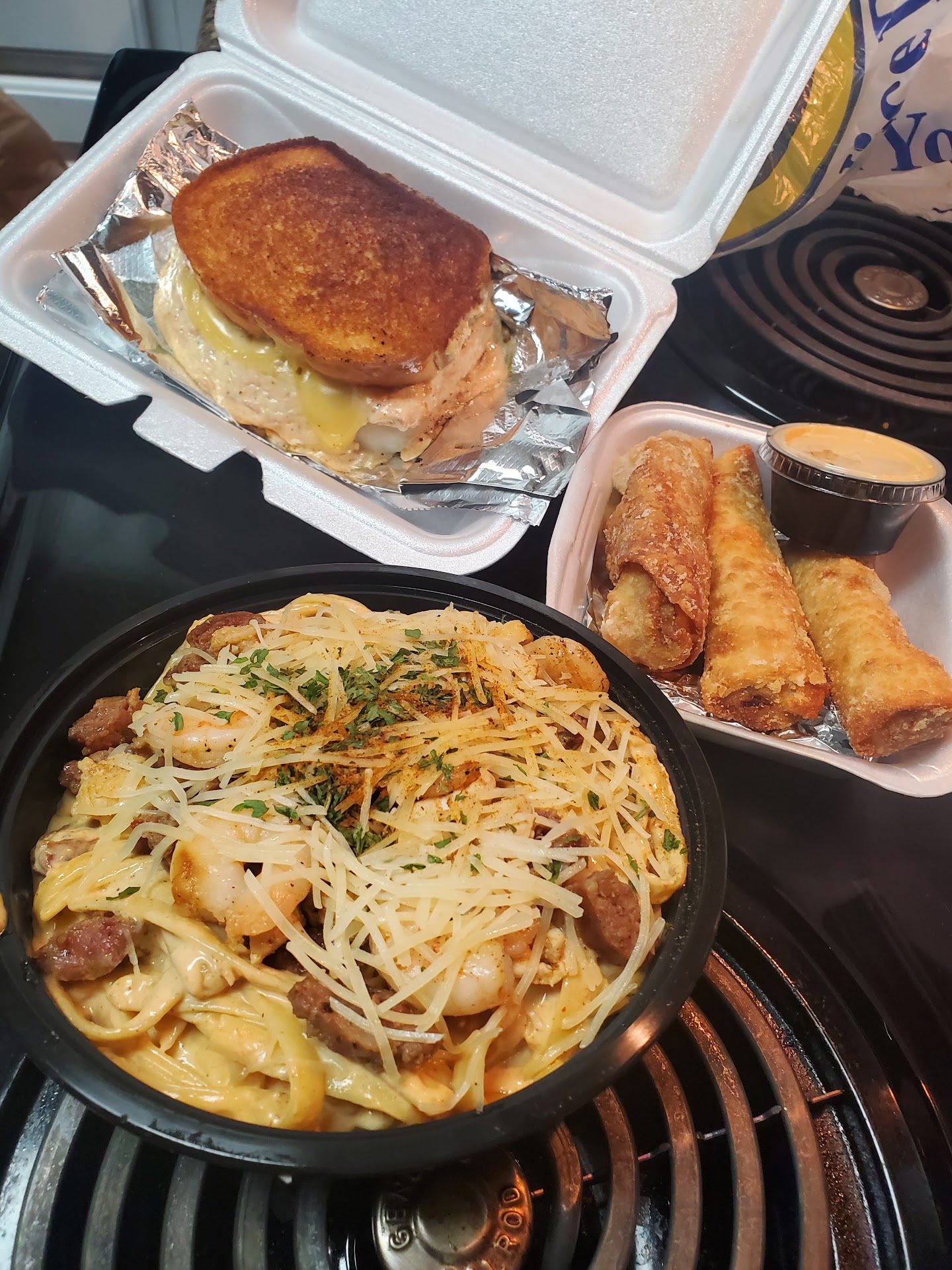 Read moreFirst time dining here… I had high hopes but I was not satisfied. We ordered the jerk egg rolls and the sauce was tasty and the stuffing for the egg rolls was tasty BUT the egg roll wrap tasted sweet (like cinnamon sugar sweet). For me the flavors were isolated and didn’t mix well. For entrees we ordered the catfish which was fried well but under seasoned (served with two sides) Mac and cheese and fried lemon pepper okra (burned). We also ordered the fries topped with Alfredo sauce, sausage and shrimp. Just like the egg rolls the flavors with the fries did not blend. The Bayou fries could’ve been really good but they lacked flavor.