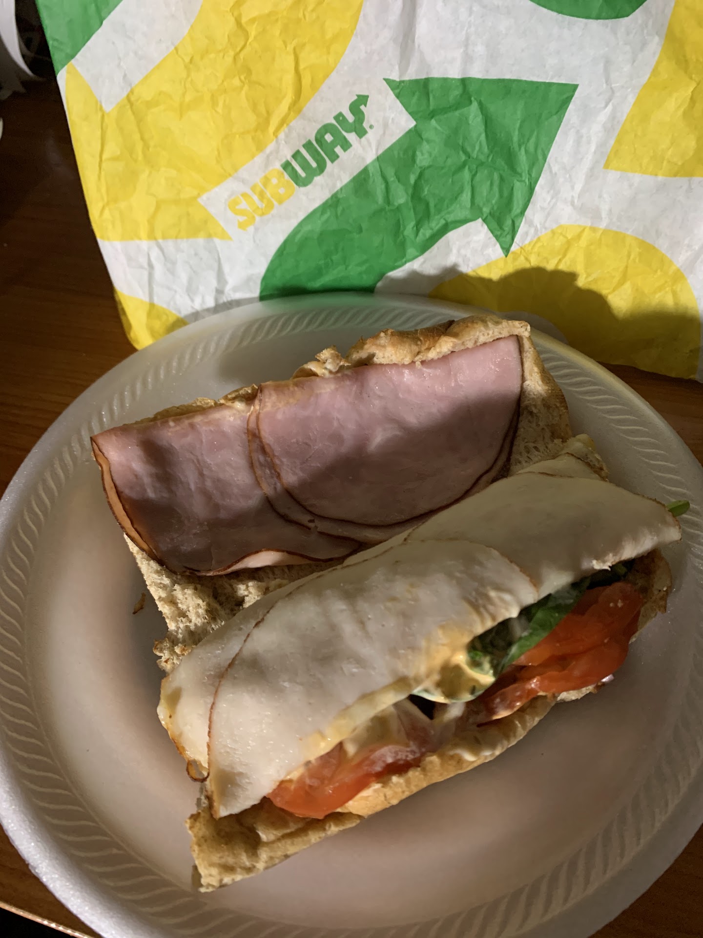 I order through Door Dash, 1 - six inch ham and turkey sub and it was so good! I give it 4 stars 🤩🤩! But, as you can see , it looks nothing like the commercials so full of meat, cheese and vegetables that you can’t help but see it. But, I couldn’t give you that picture because mines wasn’t fixed like that. Therefore, I open it up for you to see. Although. it looks nothing like what’s shown on television it still was very good. All the ingredients were fresh and my sandwich was hot and goooood! 👍