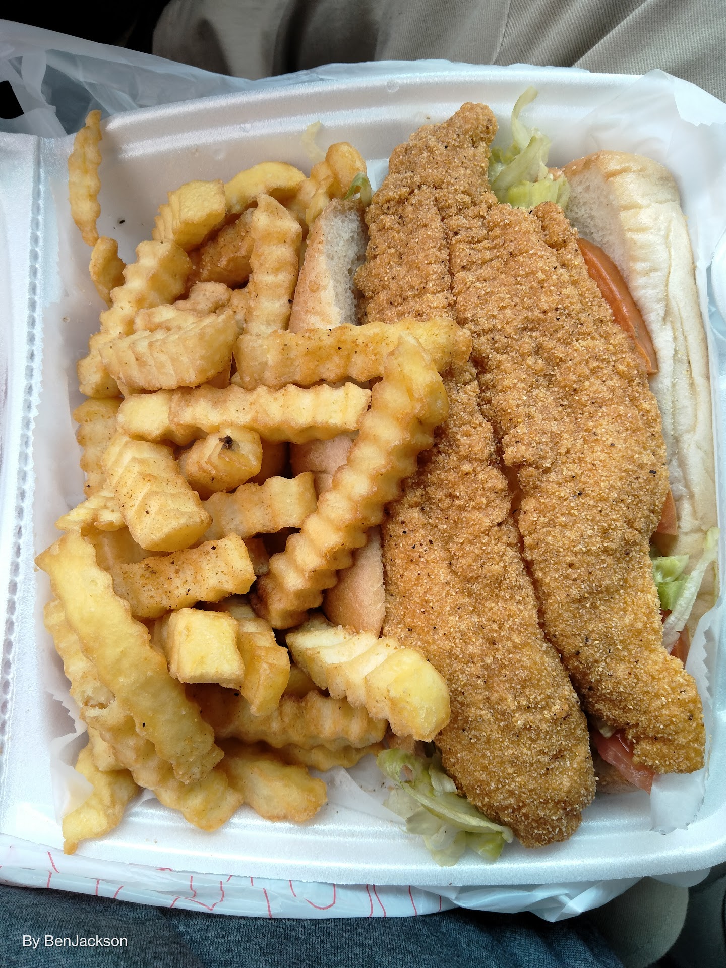 This place is at a busy intersection, I've smelled what they're doing for years but never stopped in. Until last week. I'm usually let down when I start craving a place and stop in, but not here. They have a huge menu and can serve up any fish you would want, in a sandwich, poboy or fillets. Catfish, whiting, perch, oysters, wings and more. Very impressive for a joint sharing space with a gas station. I was a little intimidated by the vast menu and chose a catfish poboy combo maybe too quickly. I did love it but I would have preferred some perch fillets just because they're so hard to find anywhere. My point is to really take in the menu, no need to rush, get what you really want. The cook overheard my order and I realized he was starting it before I had paid. There was no line when I got there at 10:50 but they gave me the vibe that they could handle a lunch rush. So don't let a line turn you away, if there ever is one. If any place deserved a line this place does. I will do what I need to do to be near this place at lunchtime in the future. The photo is my catfish poboy combo. Less than $10 and everything was...
