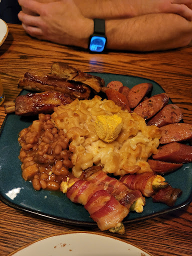 Initially, we were greeted by Maddie, our server, she was upbeat and really seemed to enjoy being there. With my friends' children, we placed their order while we continued to decide what we wanted, very accommodating instead of forcing us to order all at once. I ordered off the specials menu, the Smoked Cream Cheese Dip and, the Smoked Backyard BBQ plater. The cream cheese appetizer was delicious, with a nice smoky flavor and light chips to dip, I ended up finishing it off myself! The platter was listed as shareable. Most restaurants when listing something as shareable, a single person could eat it and be fine, but I ended up taking half of it home. The portion size was definitely shareable. The mac and cheese was the center of the dish and allowed the dish to be eye-pleasing as well. The ribs were moist and fell off the bone, the cheddar jalapeño sausage was not overly smoked and delicious, the baked beans were not too sweet and the bits of meat mixed in topped it off. The bacon-wrapped stuffed jalapeños made a nice addition to the plate. Unfortunately, I was so stuffed that I was unable to try any of the desserts, but I will definitely be coming back to taste...