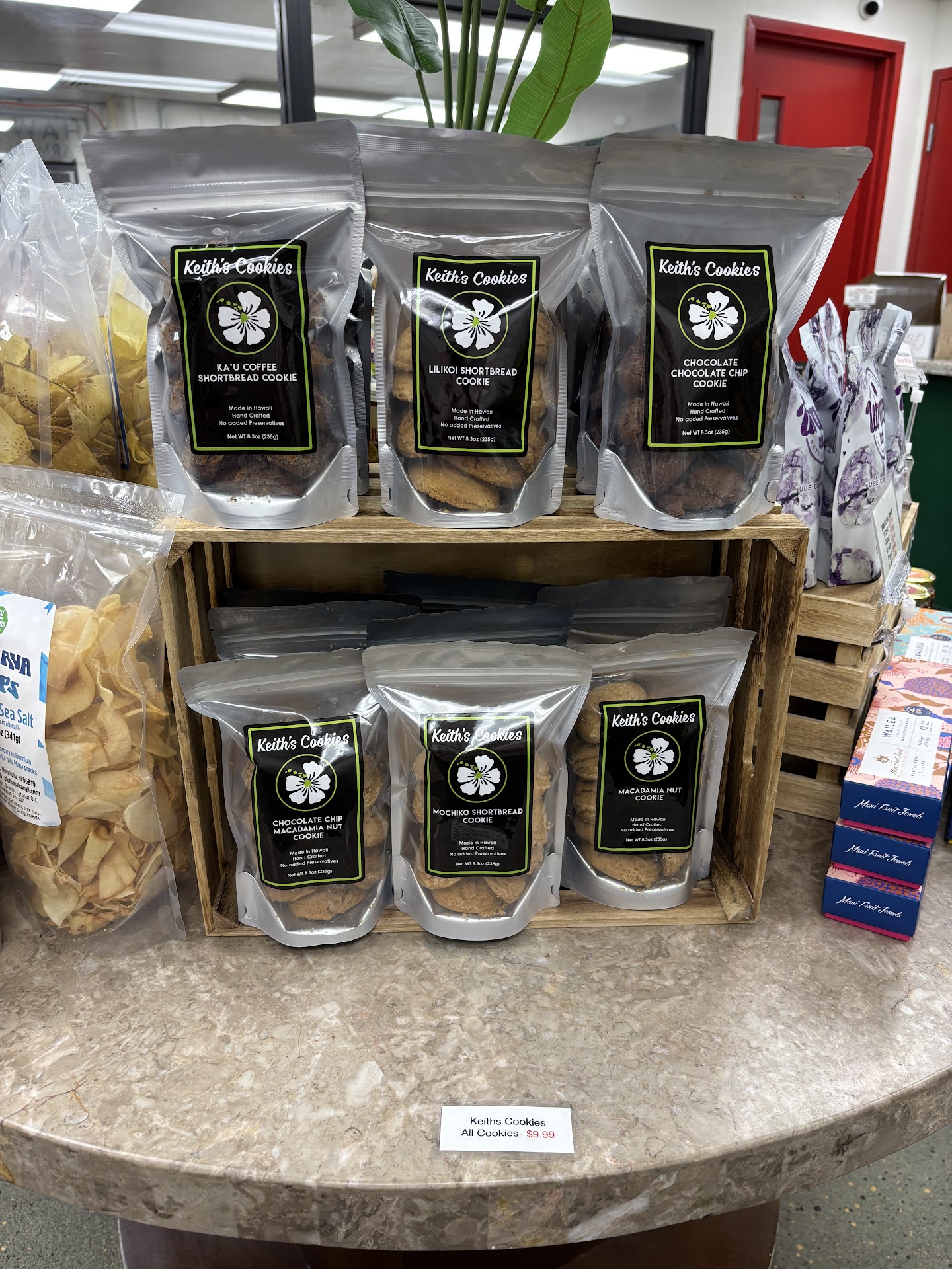 I’m a visitor from California and was on a hunt for Keith’s Cookies. I checked various Foodland and Whole Foods stores across the island; no luck. I finally found them at the ‘Ulu Chip Factory!! This is the most charming store with all locally-produced food/pantry items. They also offer freshly made hummus, wraps, and sandwiches. Stock up on snacks and gifts for family/friends. Amongst many local brands, they carry Manoa chocolate bars, Big Island Bees honey, and Ubae Crinkle cookies.