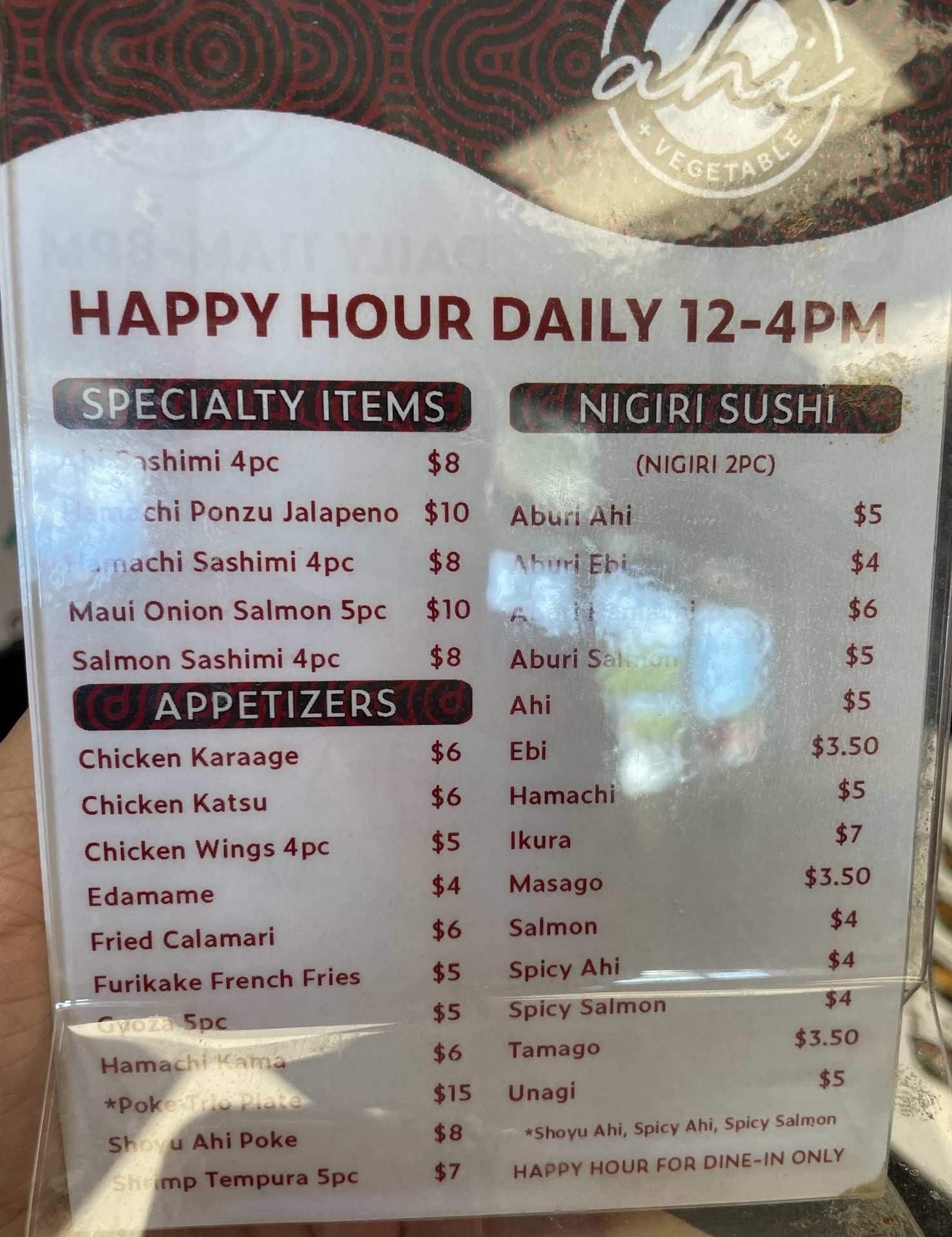 Read moreUNABLE TO TRAVEL TO JAPAN RIGHT NOW, BUT FEEL A STRONG URGE FOR AN IMAGINARY EXCURSION TO THE FAR EAST? Then, consider a short journey to Ahi and Vegetable for an experience close to going abroad. And, while you're there, please pass over their ALL-YOU-CAN-EAT SPECIAL SUSHI MENU. My brother-in-law and I tested this theory. And, I believe, it held up!!! :):):) PLEASE test my claim