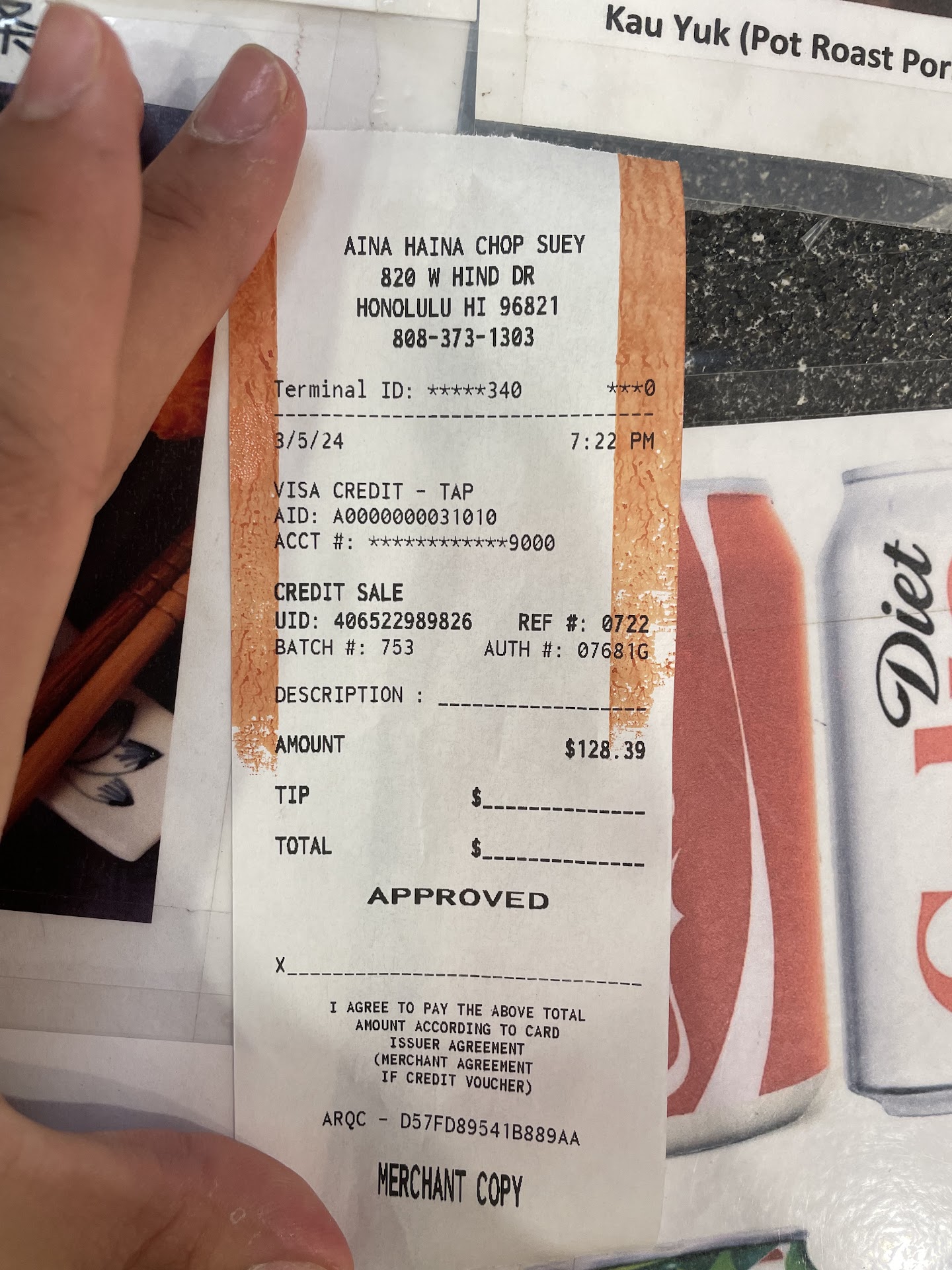 Read moreIf I could give the location negative stars I would. When I got to the counter and asked if I could dined in she ask how many people I told her it would only be me because my siblings where looking at other locations. Has I placed the order my sister's came in to add her order. The total come to $94 for only 5 plates. So I canceled one of the plates. The total was $73.83 before paying i asked how big are the plates she showed me a dined in plate for sample. Then we paid, once we paid I asked if we could set down she said you have to tip to dined in. So my sister told her canceled the order and give me, my money back. She refused and she that it was being made already, but we had just finish paying 1 minutes ago. She to call 911, then said she was going to call 911 but instead try to call the security. So, I called the security service Chad was is name, he could do anything if she refuses, So I said thank you and hanged up and proceed to call 911. Has he arrived the lady put the food out and set it on the counter. We explained the situation, he spoke to her. Asked what can we do to resolve the problem. I told him that I was willing to has longest she let's me set in dined. She refued, she said we had give tip to dined in. We had second police officer came and try to resolve the problem. She was in sock and told us that they never heard of a restaurant asking for tip just to dined in. For being my first time in Hawaii this has been the worst experience. Even the officer (Kat) said that she was embarrassed of the service we were receiving and that's not the Aloha way. She apologized, she even try to give us money to makeup for the service we received. I slowy closed her hand and told no thank you. That the money didn't matter to us. We were just trying to dined in or get our money back. Kat recommended other locations with better food...