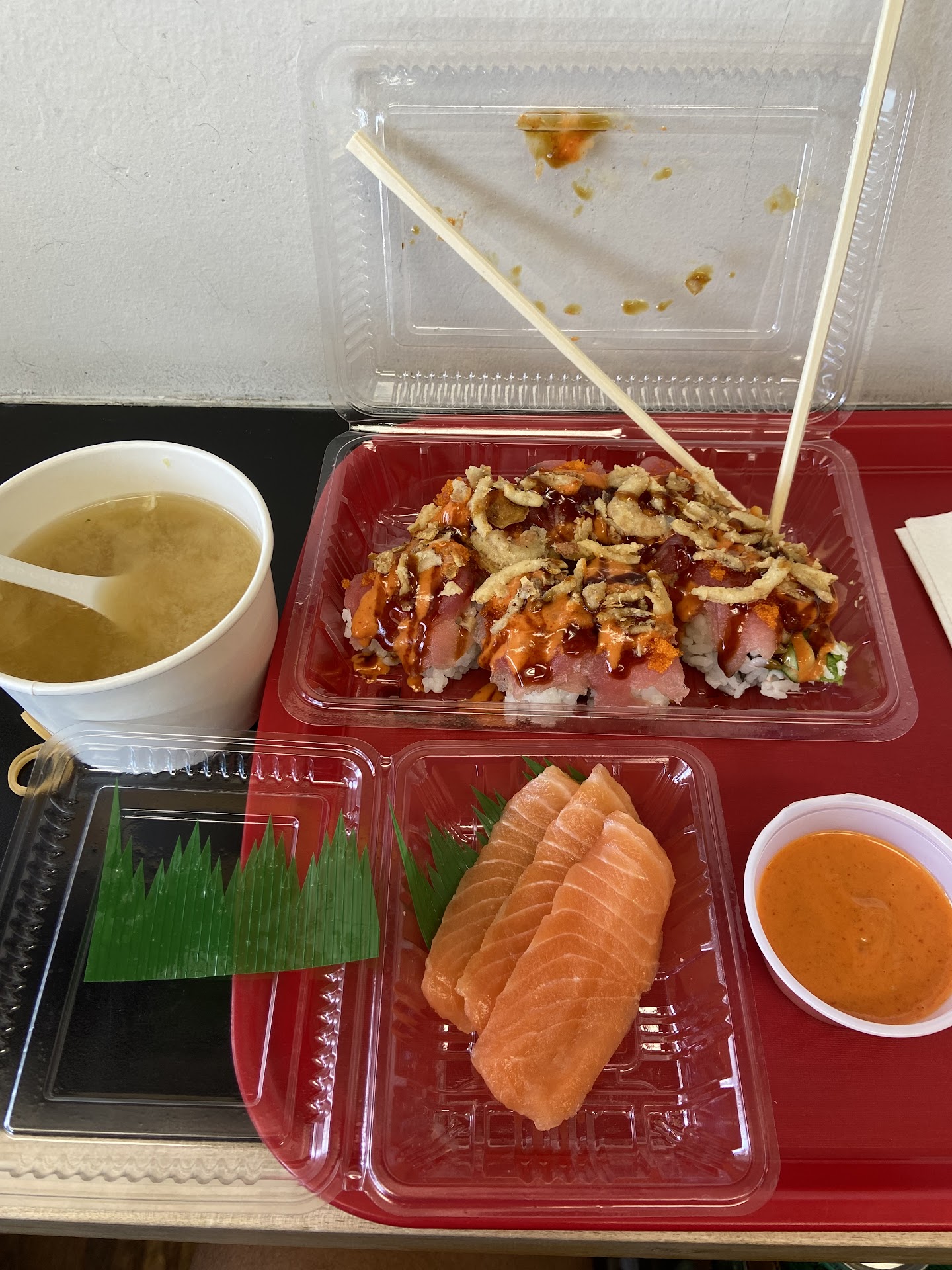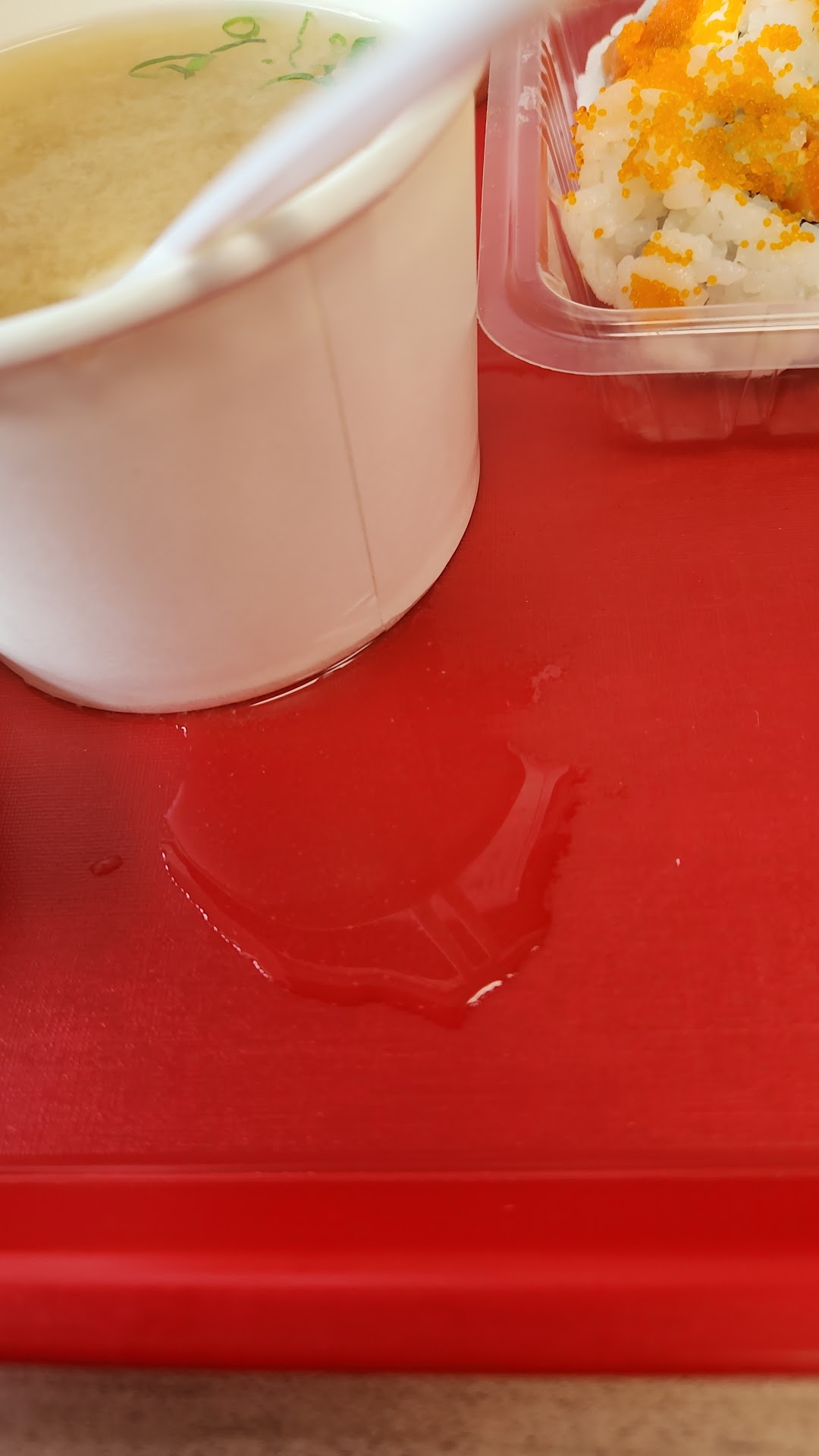 When my food arrived (I ate in the location), he pushed the tray too hard at me and spilled the miso soup. (Not a lot, but I could tell he didn't like me from our exchange about the tuna avocado Maki and this was probably a subconscious action. He asked if I wanted another, I said no its fine.