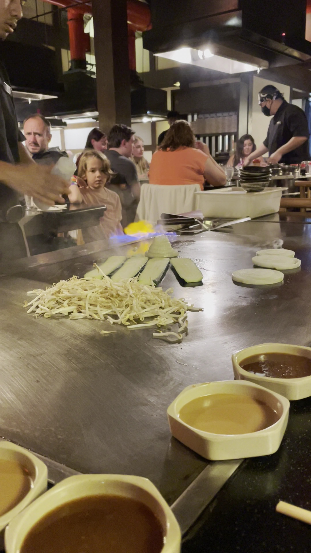 The ambiance was nice and noisy (it is a teppenyaki place after all). All the plates seemed to be hand crafted and painted. No issues with cleanliness of glasses or plates and all the chopsticks are single serve wooden chopsticks.