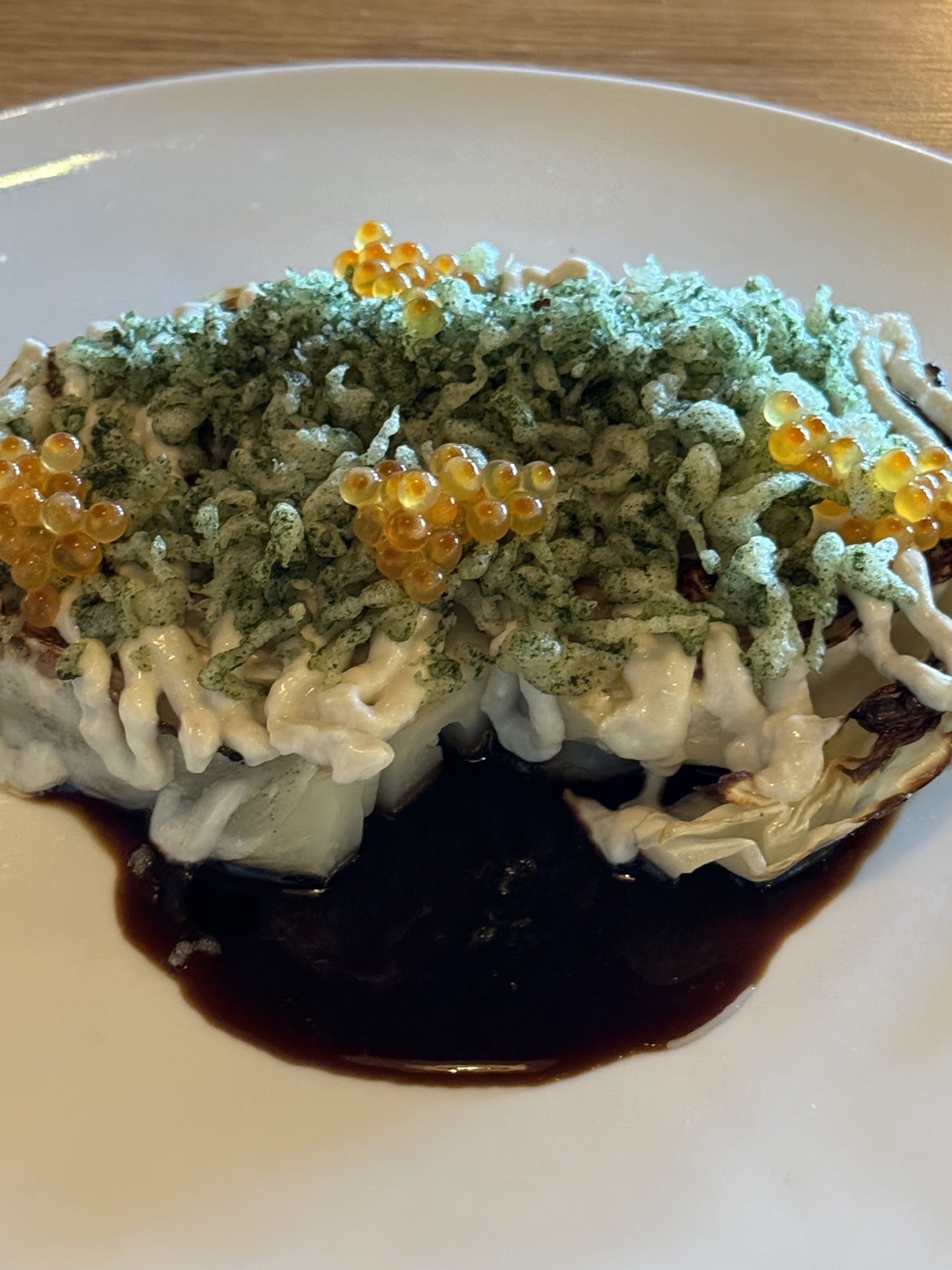 Cabbage – Lacked texture and substance. Described as a take on okonomiyaki but felt more like soft cabbage with sauce on top. The marinated trout roe added a nice pop of flavor, but overall, the dish fell flat.
