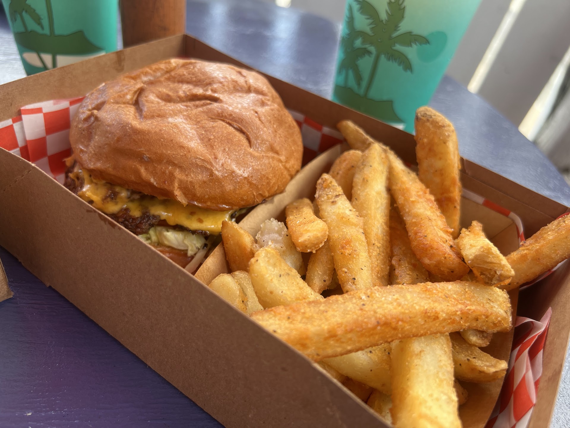 I have been doing a hunt,if you will, for the last couple months for the best burger. I am no critic by any means but like Hercules (Hur-cuel) from Murder on the Orient Express, I look for something I like and then enjoy it immensely. (I do not give any mention to the large chains of quick burgers because I do not enjoy them.) After going to two other locations and enjoying those burgers, my next stop was at Betty's Burgers over on S King Street and University. It was recommended my one of my colleges as a great burger place in town and to my amazement, he was spot on! First off, its a "blast from the past" if you will with a diner feel and the music to go along with it. I can only imagine that this is what Hawaii had back in the day. Which the owners Jed and Moe can probably attest to. With the stage set, I was only to dig into the plot. You stand in line and order at the counter. A large menu is posted on the wall to your right and is handwritten in very large colorful letters the incredible menu they have at Betty's. Many burger selections with many different flavor profiles. Chicken and even a plant based burger (which I have yet to try). I ordered a simple cheeseburger with fries. I wanted to see their quality in a simple burger before jumping into different flavors. The cashier was bubbly and smiling and very helpful as she rang my order up. I noticed that the to-go bags all had colorful drawings of sea life on them and asked if they hand draw the pictures on the bags to which she responded yes. Bravo. Next I was given a number to place on the table so the wait staff could correctly match the food to the customer and I sat down. I enjoyed perusing the art work on the walls as I waited and soon my food was to me in under ten minutes. It was piping hot. I had to wait to enjoy the very delicious steak fries until they cooled off a little. They are big fries too. You can see the seasoning on them which gives you that excited feeling to dig in! The outside is every bit as yummy as they look and pure potato on the inside. Well done! Next it was onto the burger! The bun was warm and soft like it was just made. I could smell the amazing juices from the tomatoes and cheese to the juicy burger itself. I took a bite and WOW was it amazing. Cooked to perfection with just a slight hint of pink in the middle! Every flavor had its place! They all complimented each other and made for a great burger. It was juicy and tender and moist. I could tell immediately that this was quality meat. You could taste the seasoned ground beef, not just a processed meat patty like you get at fast food. It appeared to be hand made due to its shape. It had a slight bulge in the middle like it was rolled and pressed by hand. The whole burger was by far the best I have had on the island so far. I will eventually be onto the next place to try their burger but I am enjoying my time at Betty's until then.