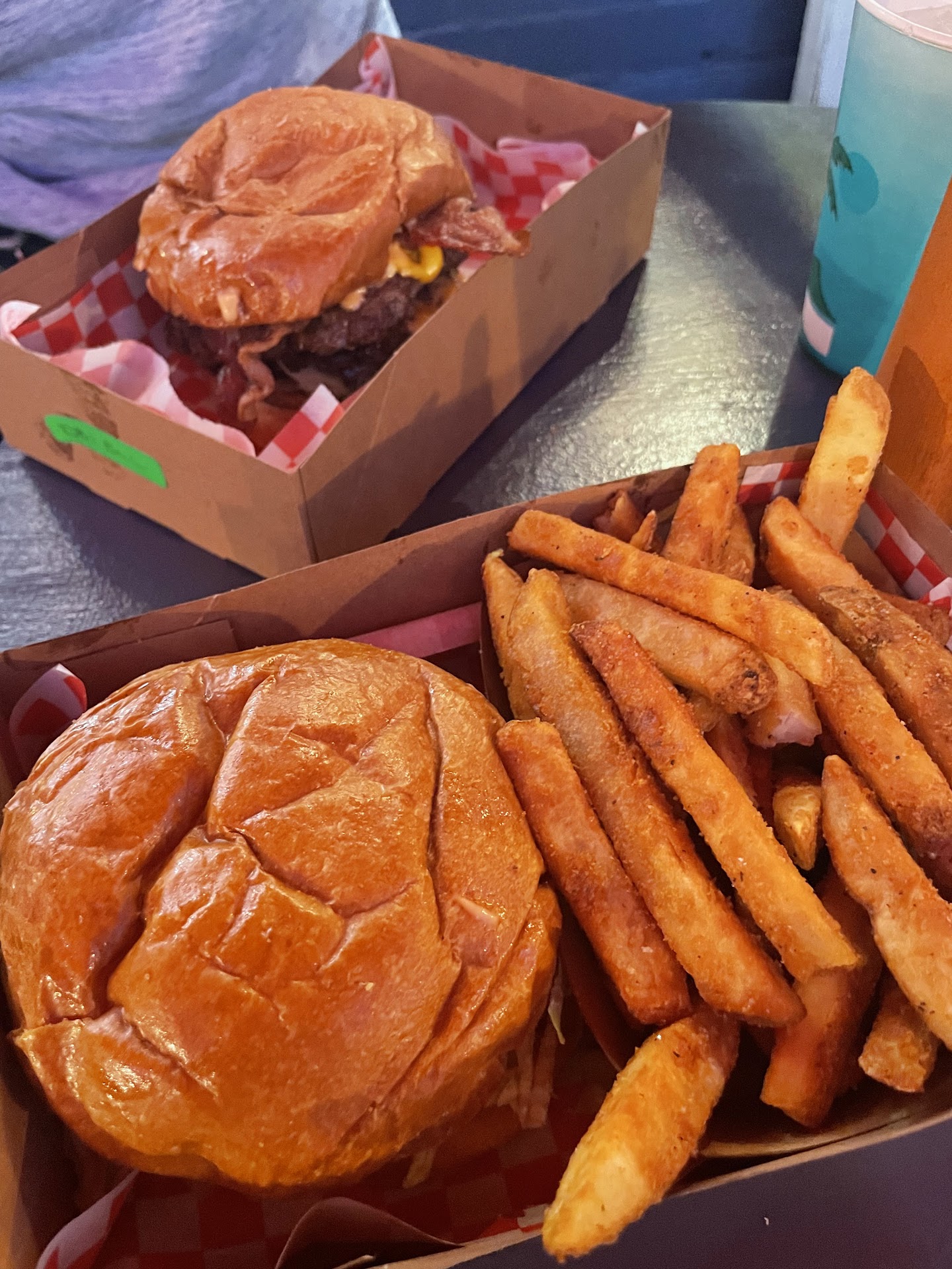 The food isn't bad. It tastes fine. The problem is they call their hamburgers "smash burgers", but what they served is not remotely "smashed". Smash burgers (like their name suggests) are supposed to be smashed thin/flat and have crispy edges that overlap the bun. What we were served were lumpy, small, thick burgers. They basically looked like someone grabbed a chunk of ground beef and threw it on the griddle, with zero shaping or smashing. The hamburger patty I was served only covered half of my bun. My son's looked the same...lumpy, misshapen and half the size of the bun. I guess you could say it was kinda like a smashed meatball shape. The fries were fine. Again, nothing amazing, but fine. They don't have a combo deal, you have to buy fries and drinks all separately, so it adds up.