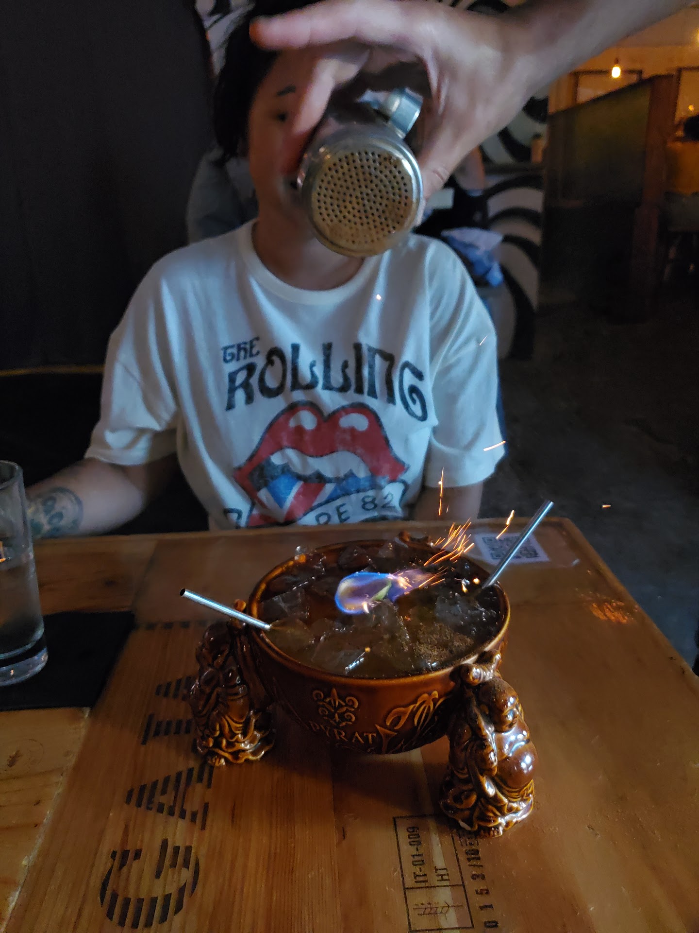 Service was beyond nice. Our servers was so friendly and apologetic because they were short staffed and the drink we ordered, which was their specially 2 person bowl, takes the bartender an extra long time because it takes a bunch of ingredients that need to be perfectly measured to make it just right, which we appreciated the attention to detail. It comes out and gets set of fire! Talk about presentation. It comes in a bowl with little Buddha's on it, is built for two and definitely had more than enough drank in it for two and might I add was absolutely delicious! Coming in at $22 (if I remember correctly), it's not the cheapest but we'll worth every penny. We almost ordered a second one it was that good!