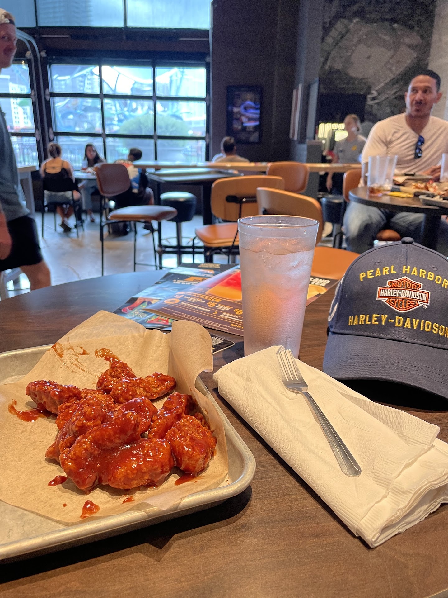 Next, and the biggest reason why I gave this place two stars - the food was salty as hell. It was like the cook watched too many Salt Bae videos, but it was the GIF version that was stuck on a perpetual loop. I know some restaurants do this trick to get people to order more drinks and alcohol, but the nachos that we got was literally filled with salt. It was so bad it overpowered any semblance of nachos. The only good appetizers we got was the onion rings. Even the chicken wings was just okay. The boneless ones were dry and inferior to the regular boned ones, but that's not saying much. The sauces were pretty good, though. Overall, the chicken was dry. In a nutshell, come here for the atmosphere and maybe the experience, especially if you are an overseas tourist, but definitely not...
