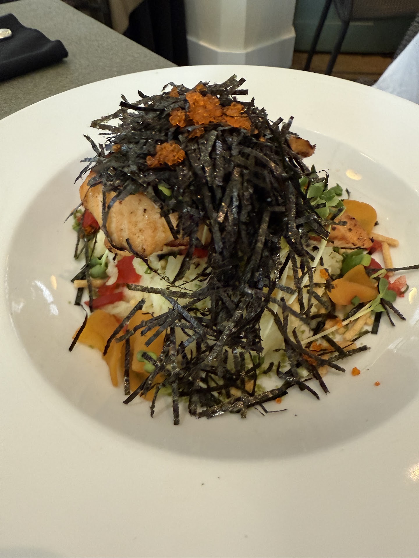 I had the garlic ahi sandwich that had a nice sized fish filet that was perfectly cooked and plated. The Salmon Ochazuke was also ordered and it was beautifully plated presentation that words just can't describe. Also, a Chinese Chicken Salad which was of fairly large proportions, but nothing unique by design.