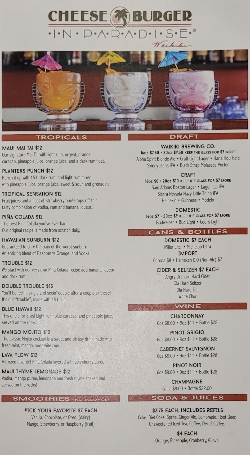 Overall, Cheeseburger in Paradise is a must-visit when you're in Waikīkī. Whether you're looking for a fantastic burger, a refreshing drink, or simply a place to unwind and soak in the Hawaiian vibes, this place has it all. And if you're lucky enough to have Joe as your server, you're in for an extra special treat!