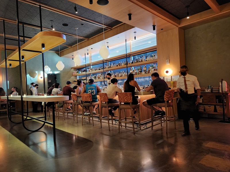The world food tour duo made a return visit to Eleven inside Foodland at Ala Moana Center. We like this spot because you can get interesting cocktails and a varied assortment of small plates. This time we opted for a bottle of wine … They have yet to expand their wine offerings; we selected the sole red wine available by the bottle, a 2020 Bourgogne Pinot Noir from Nicolas Potel ($54). It was light and smooth (for a 2020); a modicum of red fruit … perfectly acceptable wine for the food we planned to order.