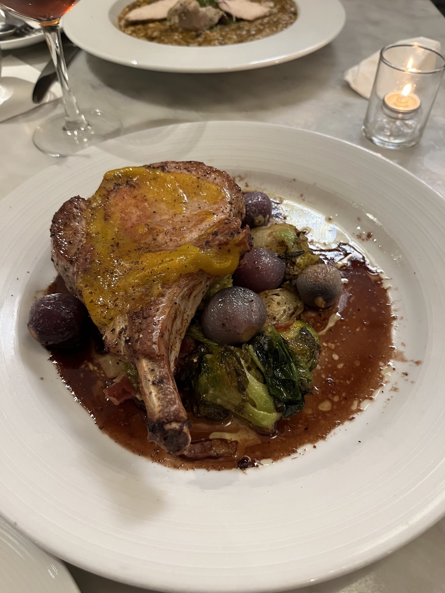 The menu and drinks menu was small, but diverse enough to give you choices. I recommend the matcha whey, which had a nice mouthfeel and a smooth vanilla finish, for a drink. I recommend getting the smoked tako , which was very tender and had a nice crispy crunchy on the outside, and the Hawaiian clam chowder, which was a little thinner than your typical New England clam chowder but was teeming with clams. I also recommend the citrus brined pork chop and every bite was delicious. The pork itself was moist and had a crisp edge. The pearl onion accoutrement was a little too raw for my taste and I wished the pork chop came with some starch as well. I also got the ube pave with guava sorbet. I would skip the ube pave next time and stick with the sorbet of...