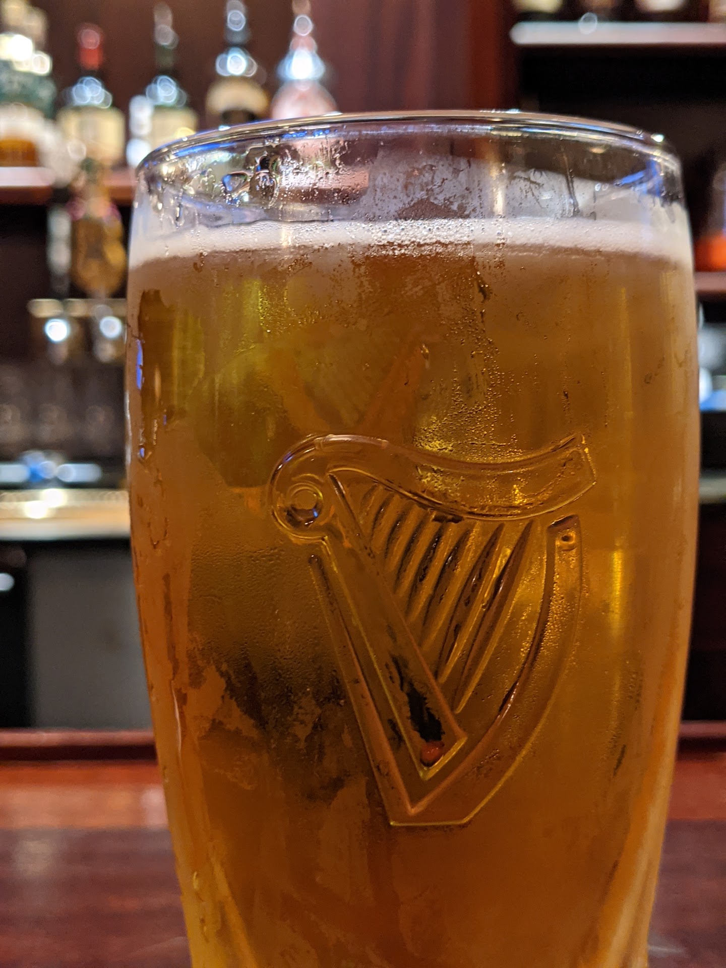 Behind the bar, the dark door wood continues as a massive cabinet and then rises up to form two pillars cradling a mirror. The cabinet proudly displays a mesmerizing kakaleidoscope of beckoning booze bottles as an Irish-looking lad, Mr. Reed, welcomes you by name with a freshly poured pint, ready-in hand.