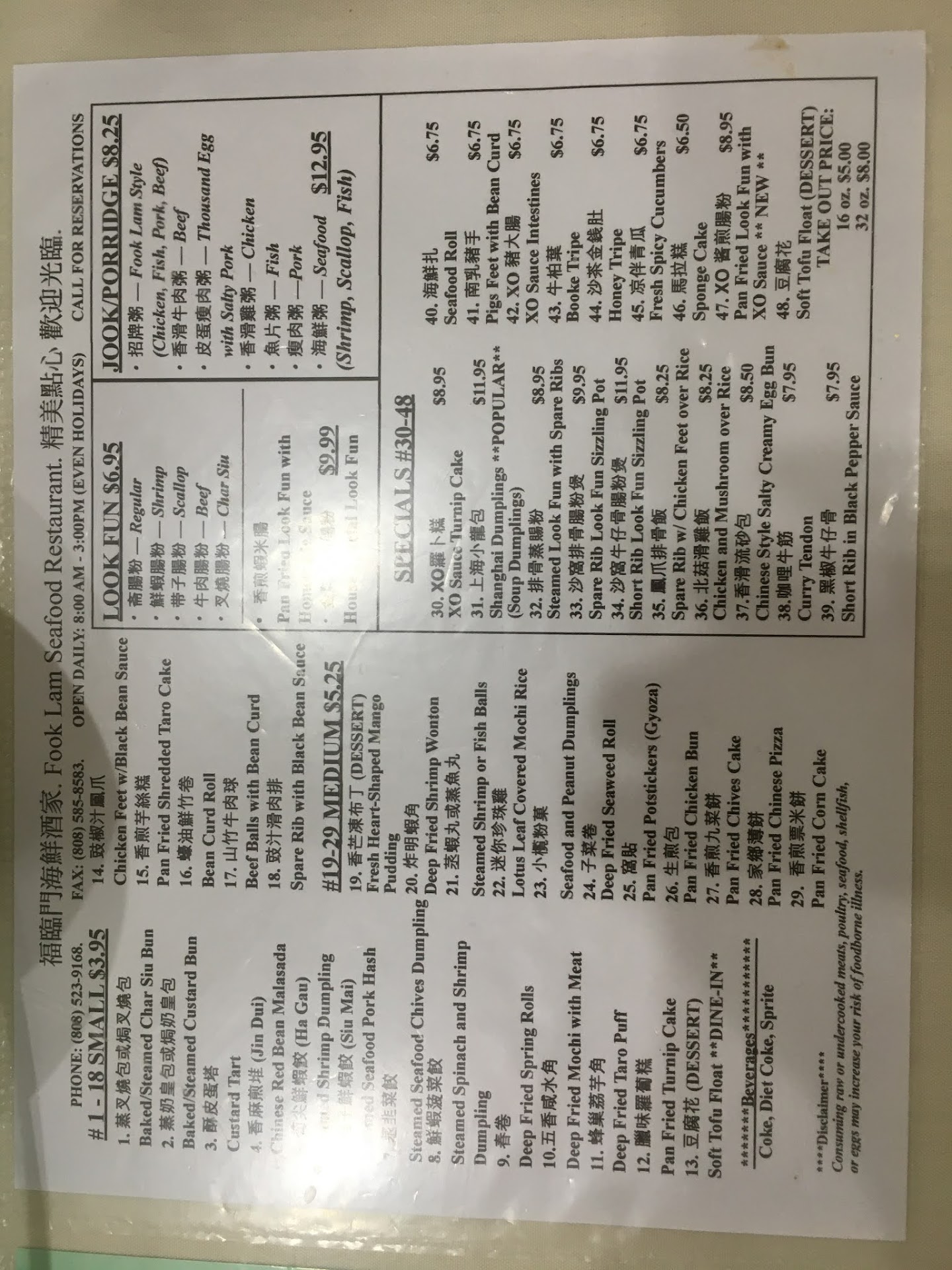 We are from Sacramento, California, and craving for some Cantonese dim sums after a week in Kailua-Kona and Hilo. After reading the reviews, we decided to give FL a try and were quite satisfied. There were some misunderstanding by first timers (me included); and I questioned the owner in Cantonese for answers. The owner, Mrs Lee, said the restaurant has been in biz for more than 17 years. It has been a favorite dim sum place for many locals and visitors. Like many reviewers, I found the chicken feet (#14) to be above average, tender with a hint of chili pepper. We had my favorites: deep fried mochi with meat (#10)—both sweet and salty; lotus leaf covered mochi rice (#22)—yummy, comfort food for me; and baked Char Siu buns (#1)--presented and recommended by staff. We were quite full and didn’t get to other favorites (Look Fun, Porridge, deep fried taro puff #11, and dessert (baked custard buns #2 or Chinese Style Salty Creamy Egg Bun #37).