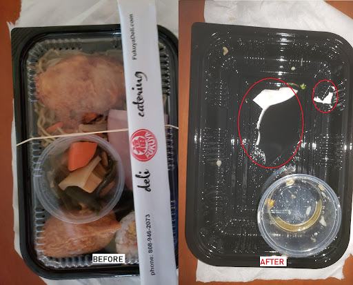 The bad news: my box fell apart even before I was able to eat it. The noodles almost fell out the bottom! (see photos) Fukuya please find a distributor that makes better quality packaging!!