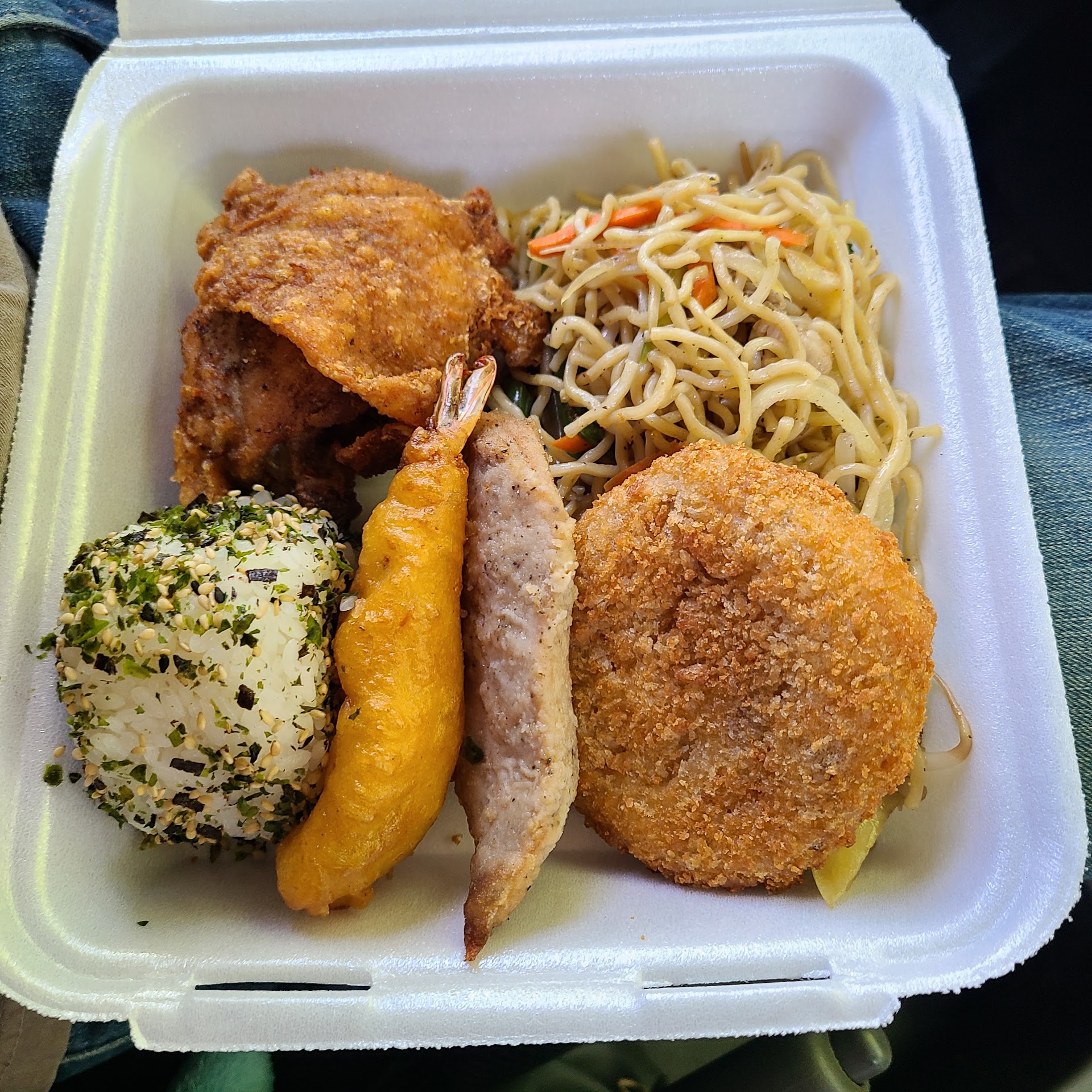 The facts: Coworker bought a bunch of bento boxes for me and my coworkers. I think we got "Bento B" with inari, musubi, nishime, noodles and a piece of chicken, cup of mac salad, and slice of ham. Food was OK, not the best meal I have had.