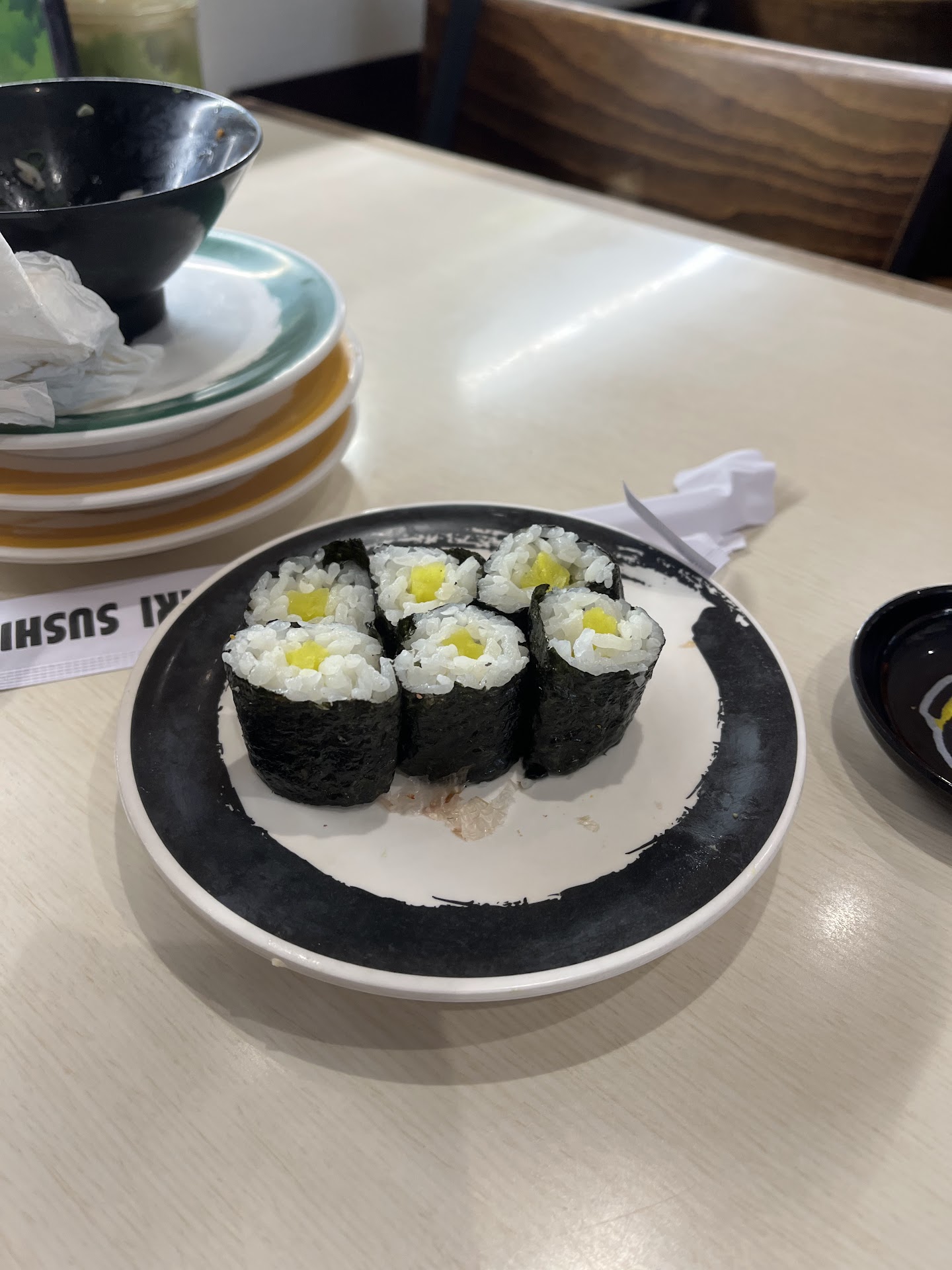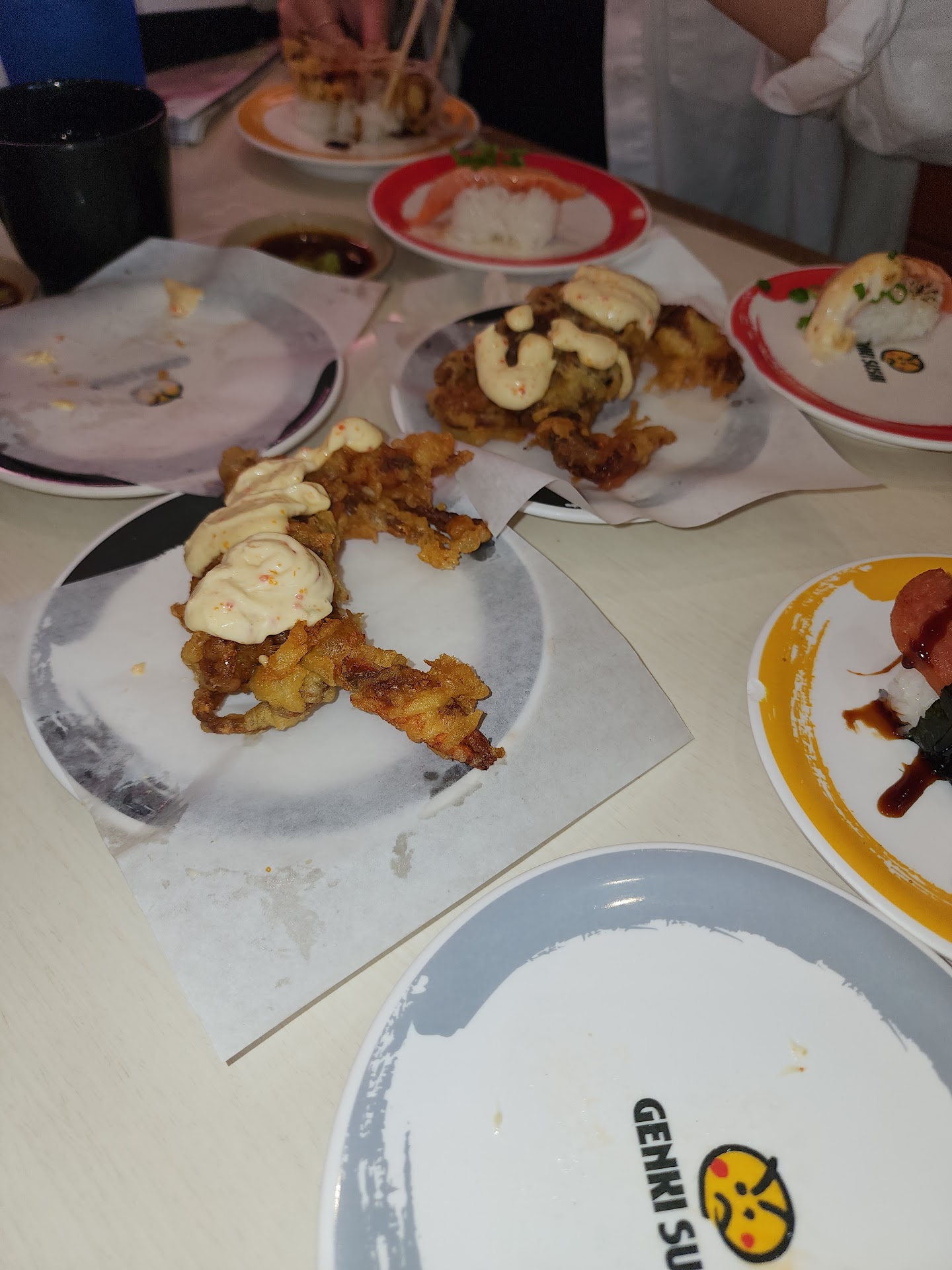 Went there today for dinner and had a disgusting experience. I ordered pickled radish rolls first thing after sitting down, and they didn’t show up. This is a common occurrence for this location, often flat out forgetting to send out sushi. When I asked a waitress about this, they sent one out on a blatantly dirty plate covered in crumbs and tempura skin. The item I ordered has nothing that resembles any of the crumbs on the plate . It’s clear that the kitchen did this purposely, the other sushi guests were receiving were not in this condition, only mines. The sushi was chopped at all sorts of different sizes, not caring at all. Additionally the sushi was on a dirty plate used for premium sushi, the one I ordered is 2.15, i.e the cheapest thing on thing on the menu, meaning they just grabbed any old plate. It’s not shown too well in the photo but the plate had a number of suspicious oily smears. This Genki Sushi like most is usually average at best, but let this be a cautionary tale about asking to get food that you didn’t receive. For all we know they could’ve smeared their nuts on the plate. Historically, Genki Sushi is a filthy establishment, even causing a Hepatitis outbreak a few years ago. To anyone with a compromised immune system do not risk eating here, even the safe stuff isn’t...