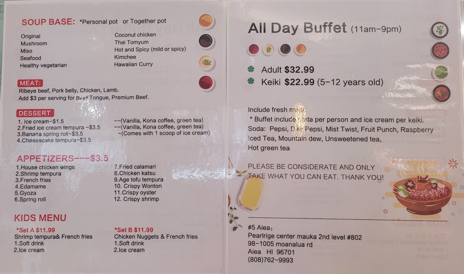 Ā Ā Ā Read morePretty pricey. $18 for lunch all-you-can-eat for adults, $16 or so for kids. However, the kids meal comes with a drink and a little dessert, so super cute. And if your little one likes veggies, then this is the joint for sure! Corn on the cob, little Japanese sausages, or arabiki, fish cake or kamaboko, and a variety of fun vegetables like snow peas and zucchini, make this a favorite for the little kids we know. the Miso soup option is mild and comes with tofu. A nice option for little kids, if they don't like a strong Seafood flavor or if they don't like anything hot or super salty. Seafood broth comes with clams, which are in your soup. Love that!