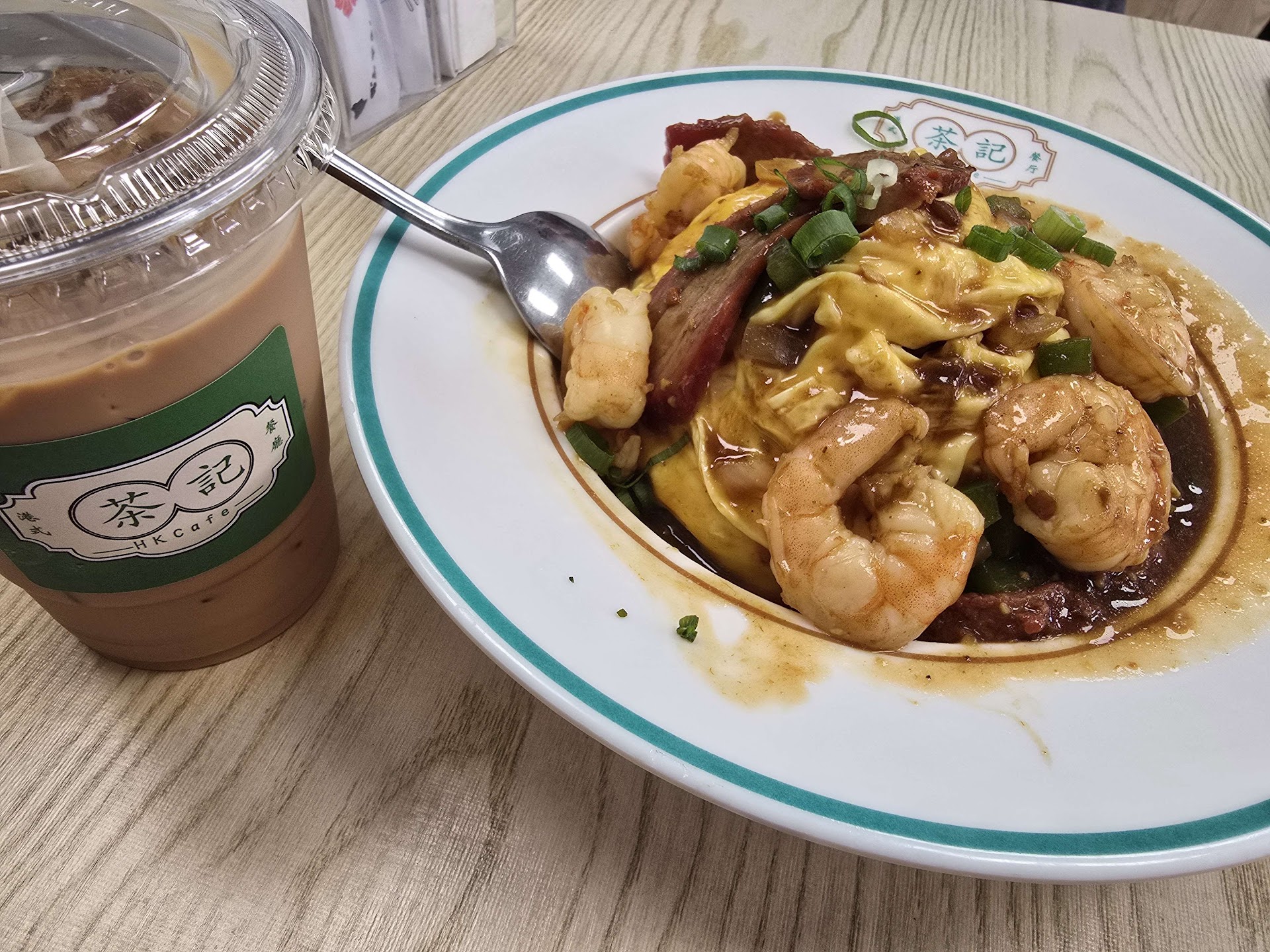 Iced Hong Kong milk tea was good, not too sweet. I got omelette rice with satay sauce, shrimp and char siu. The satay sauce had lots of peanuts in it and went well with the ingredients. The shrimp tasted better than the char siu but both are good. My husband got chicken with green onions, 2 sunny-side-up eggs and fried rice. Green onions with their scallion oil is always a great combination with chicken and rice. They also had lots of porridge and noodle options on their menu, and after 11am they have baked rice as well, which is difficult to get from other Chinese restaurants.
