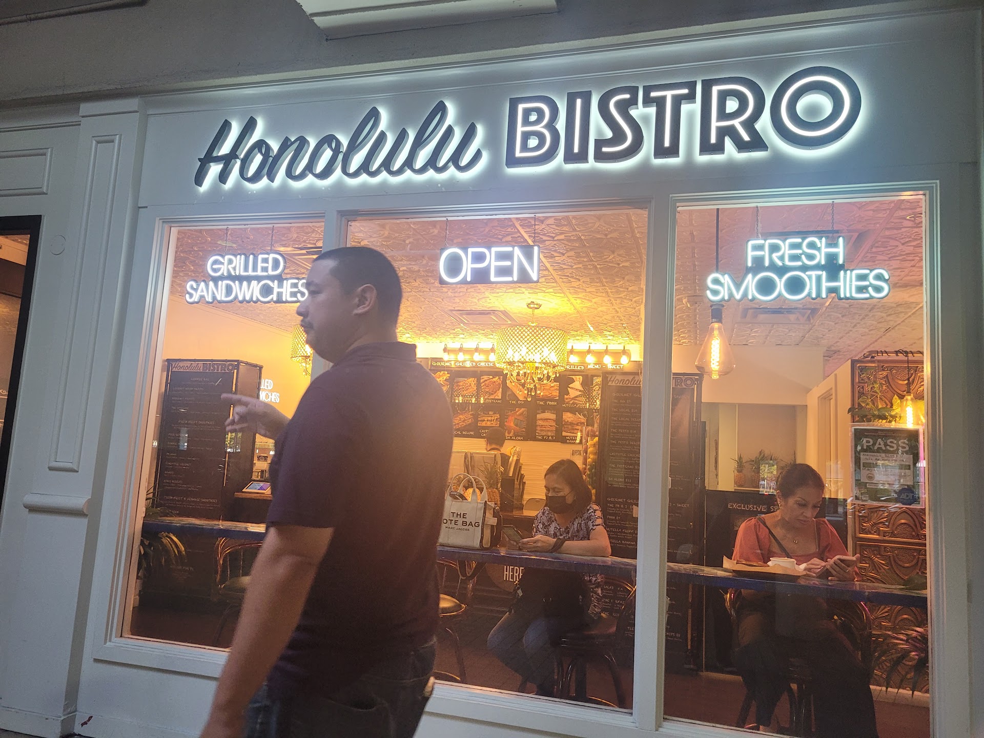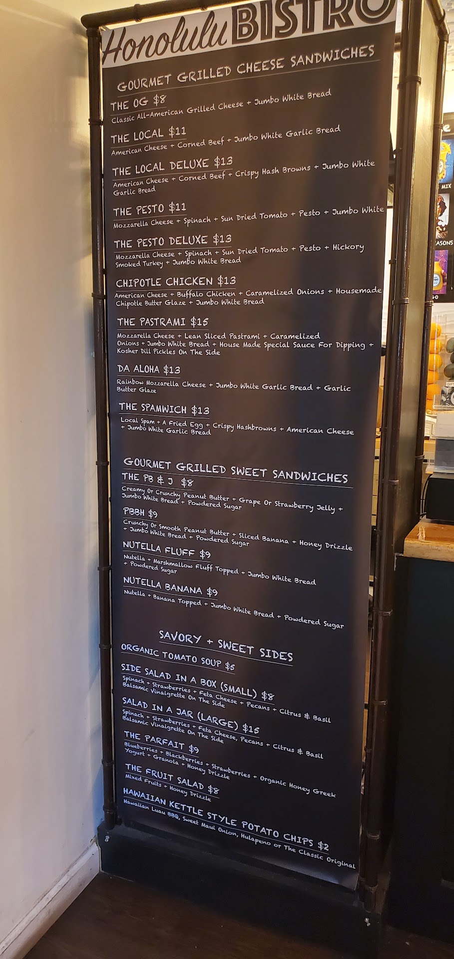 Decided to come and try this cute Cafe area. :) And I absolutely love it! Their menu is amazing and I love that we got to buy Jars, because not only does it save on plastic use, but for every time you bring your jar back for any drink of choice... you get a discount off your drink. :3 Although the Cafe is small and cute, there isn't much room in terms of seating. I'm not sure about the rules of the mall, but I do sort of wish they had outside seating for people to pass by and enjoy as well, Now, the food on the other hand, I had so much fun with it... there were so many different fun things, so I went with da Aloha sandwich. A basic cheese sandwich but just colored as a rainbow. 🌈 I especially loved it because it allowed me to be a child again and do that fun action of stretching the cheese of the sandwich. 🥪 The pesto, I loved eating. I had it with the homemade recipe tomato soup they had. As while my other half got to enjoy his portion of sandwich choice and drink. There is fruit smoothies, like the one I had called the four seasons. While my other half had peanut butter and banana smoothie. As well as the Nutella frappe. :) I had so much fun as this location and I especially love their resin table piece. It blew my mind and was so amazing to see in person! Because you don't come across beautiful resin pieces like that everyday! It's among the pictures! ;) But I just absolutely loved being here. And thank you so much to Honolulu bistro for their...