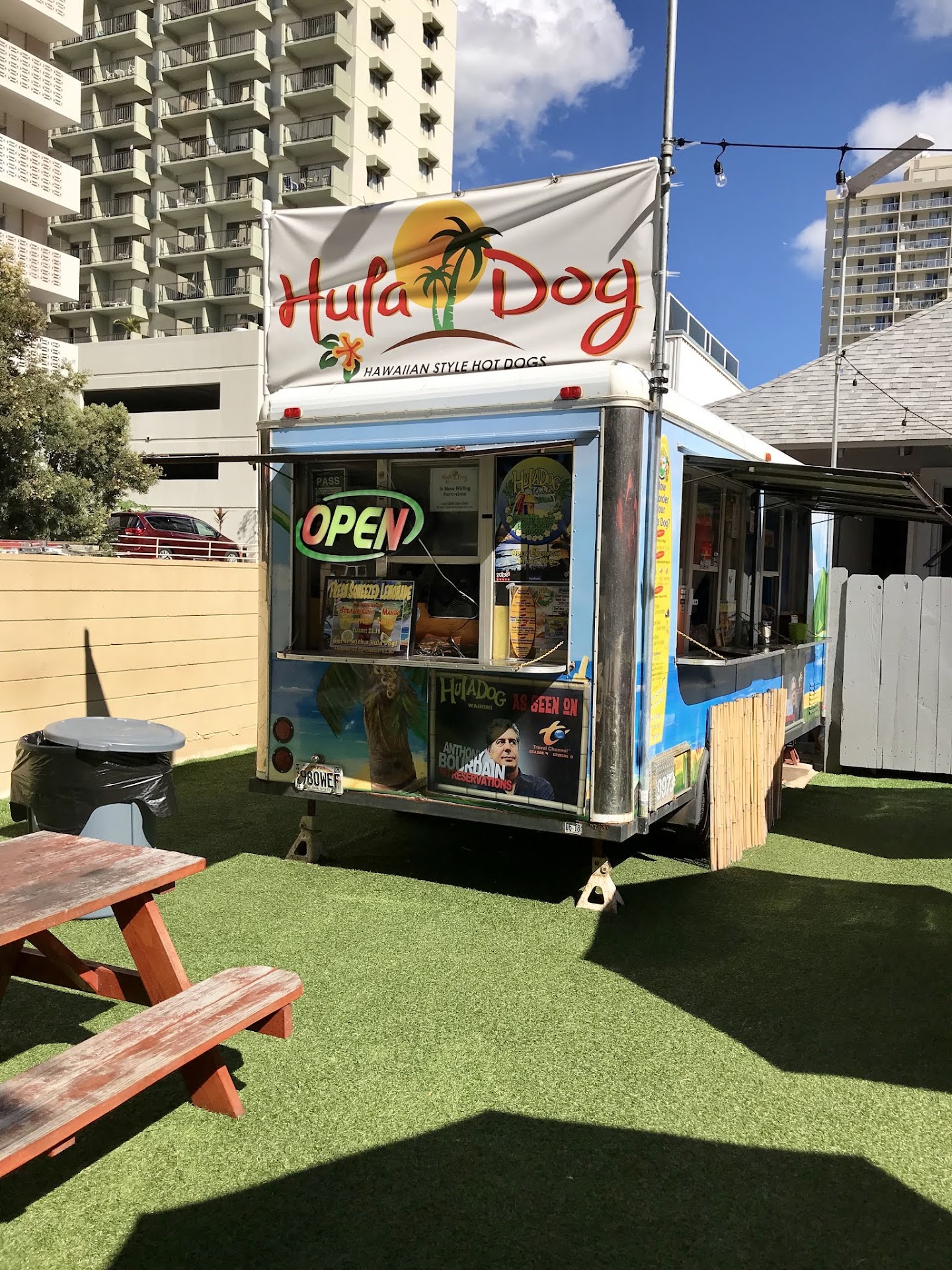 Read moreWhile planning our Hawaii trip we heard that we must try these amazing "Hot dogs". We made the effort to find their location and try their wares. When we approached there were only 2 ladies at a picnic bench waiting for their order. There are 2 windows on the side of the truck, one for ordering and one for pickup. We stood in front of the order window for approximately 5 minutes while this dude was making some lemonade. There was absolutely no greeting or acknowledgment. I finally leaned over to the next window and asked him if he was open...He said "Yes". Wow.