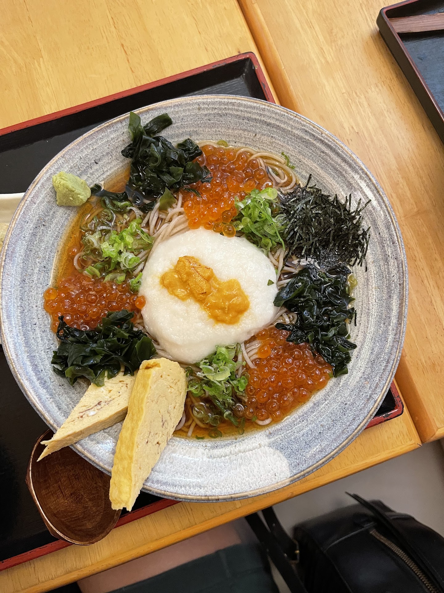 True soba is made with 100% buckwheat, and you can really taste the difference vs store-bought soba which is a mix of buckwheat and wheat. My favorite is the hana soba which contains tons of ikura, yam, and uni. Its texture might be off-putting to those who aren’t familiar with grated yam, but the dish is so refreshing. You really can’t go wrong with any of the dishes here.