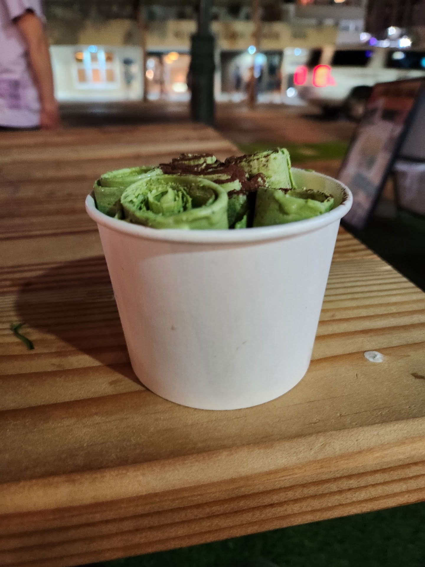 Read moreI visited Ice Cream Rolls Hawaii at 8:30 pm and there was only a very short line ahead of me. I ordered the Matcha Green Tea ice cream rolls. The Banana Carmel was sold out, but that was not a problem since I didn't want to order that. Each dish was 12$ for six ice cream rolls. You can see the person working at the front making the ice cream through the see through stand which I will tell you is VERY SATISFYING WITH ASMR NOISES!!! I thought the ice cream was very good and would give it an 8/10. It had strong matcha flavor and you can get 3 free toppings to choose from. (There are around TWENTY toppings to choose from!) Would recommend extremely and it's not too pricy! SIDE NOTE- If you have seen other reviews with the price marked 10$...