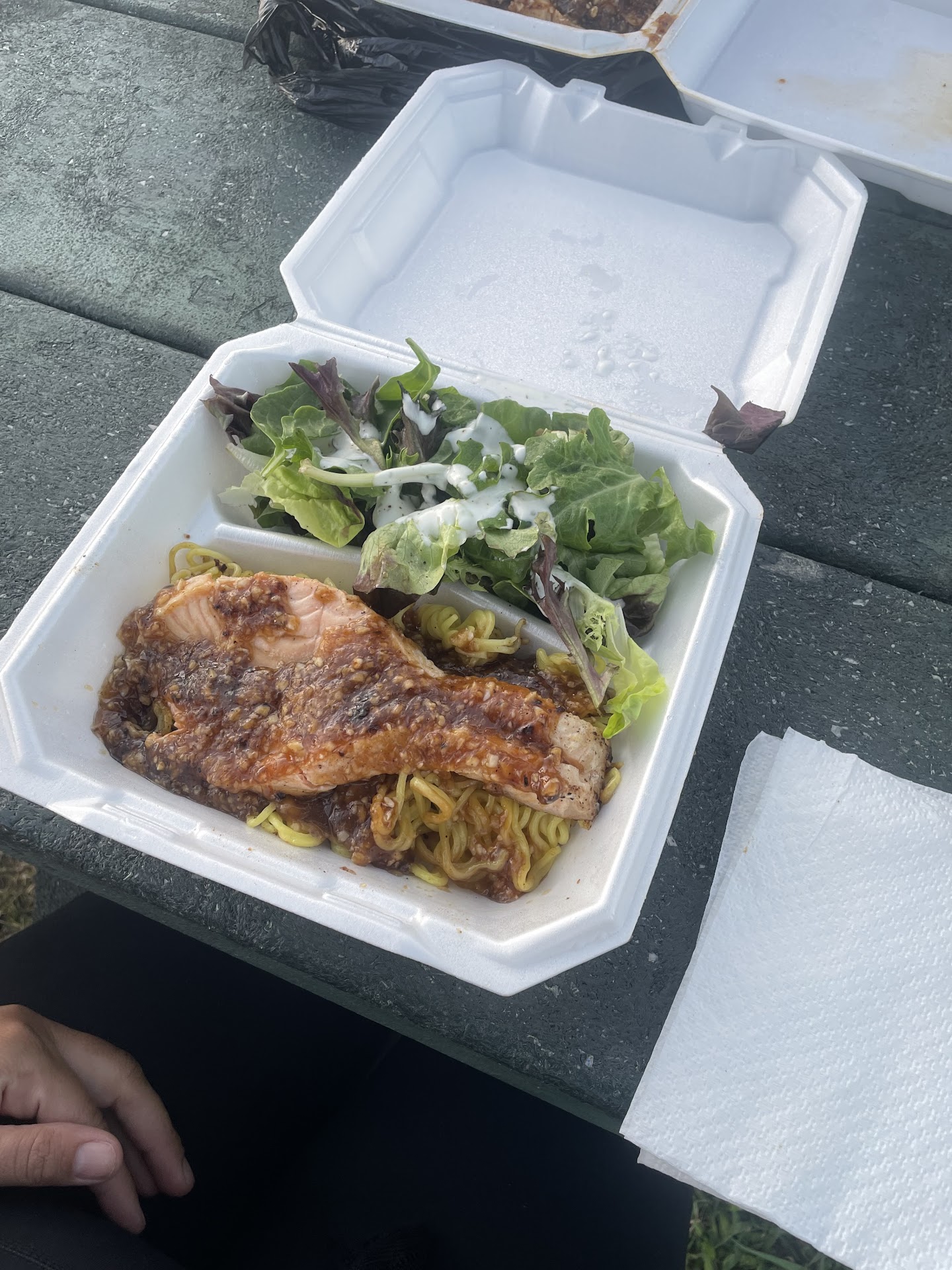 I got the steak option with added shrimp, asparagus, broccoli, with garlic fried rice. The meal came with a nicely-sized side salad and the dressing was excellent. The portions are more than enough for 2 people and the presentation was great for something that got boxed up! The steak was ample, tender, and cooked expertly - the quality cut of ribeye used was very clear.