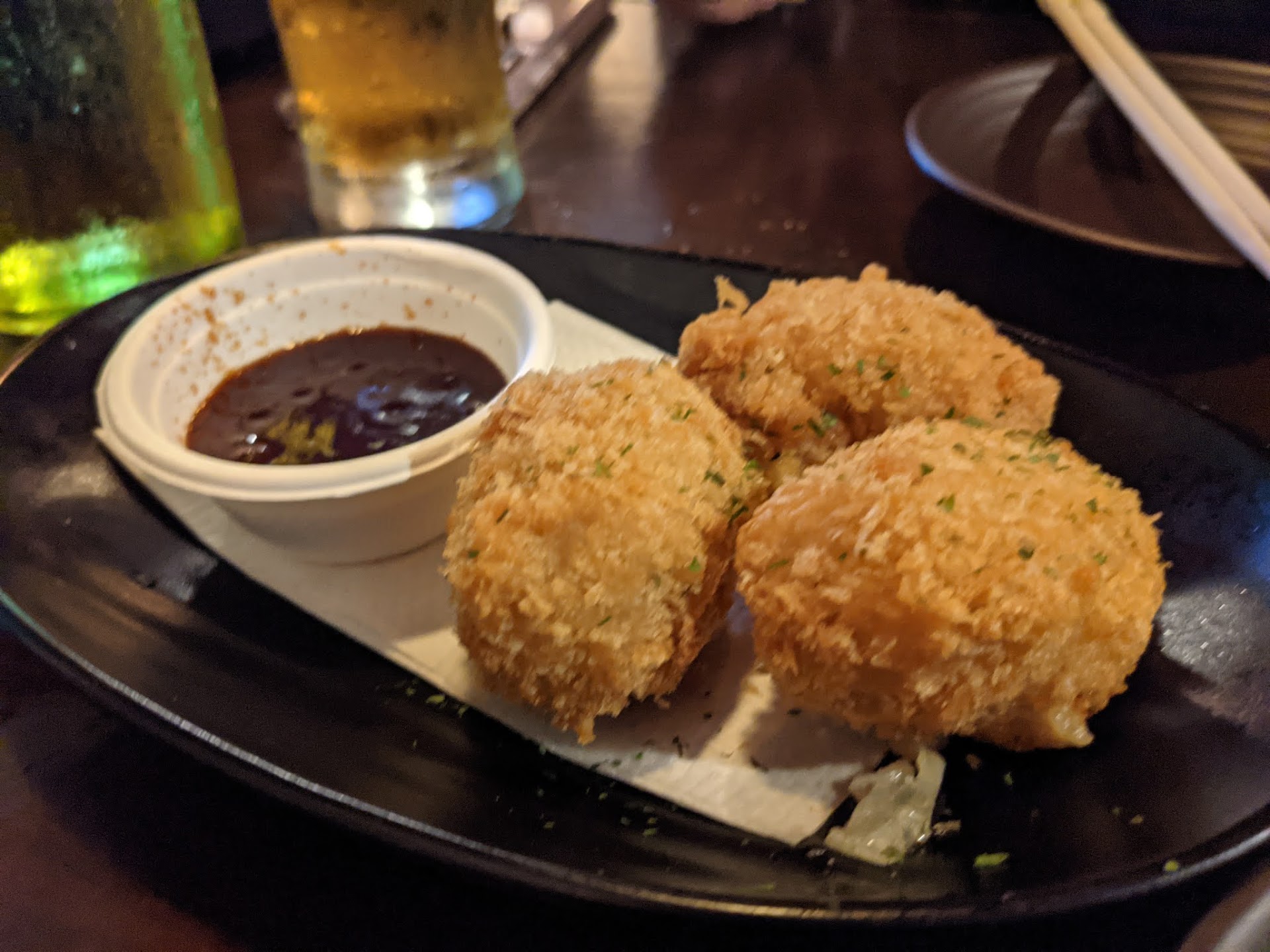 FOOD We ordered the cream croquettes, takoyaki, curry udon, okonomiyaki, and karrage (all pictured here), as well as CALPIS-Hi Japanese cocktail and an Asahi. Cream croquettes: The cream croquettes were fried to perfection, its white stew center (the "cream") fantastically soft, and yes, creamy. Everything was amazing, but these were possibly my favorite! Takoyaki: The takoyaki was served piping hot, as all takoyaki ought to be, and quite possibly sent my husband into another world. The takoyaki was definitely his favorite, though the karaage was a close second. Karaage: Karaage seems like it should be a pretty simple Japanese dish to make, but as anyone who's made it knows, getting it fried to a perfect crisp --while keeping the chicken moist-- is a challenge not meant for the faint of heart. Their karaage was a mix of dark and white meat (the majority being the former) with an impressively crispy coating that complemented the natural flavors and moistness of the chicken. Served with the standard mayonnaise sauce, this dish is a must. Curry udon: While this may be the easiest culinary feat of the bunch, it certainly did not disappoint. Standard udon served in a tasty broth and topped with homemade curry, this dish hits the spot when it comes to nostalgia. Okonomiyaki: This okonomiyaki is light on cabbage and strong on batter, which happens to be just how I like it. My husband likes his okonomiyaki the opposite way, so this dish just depends on your personal preferences.