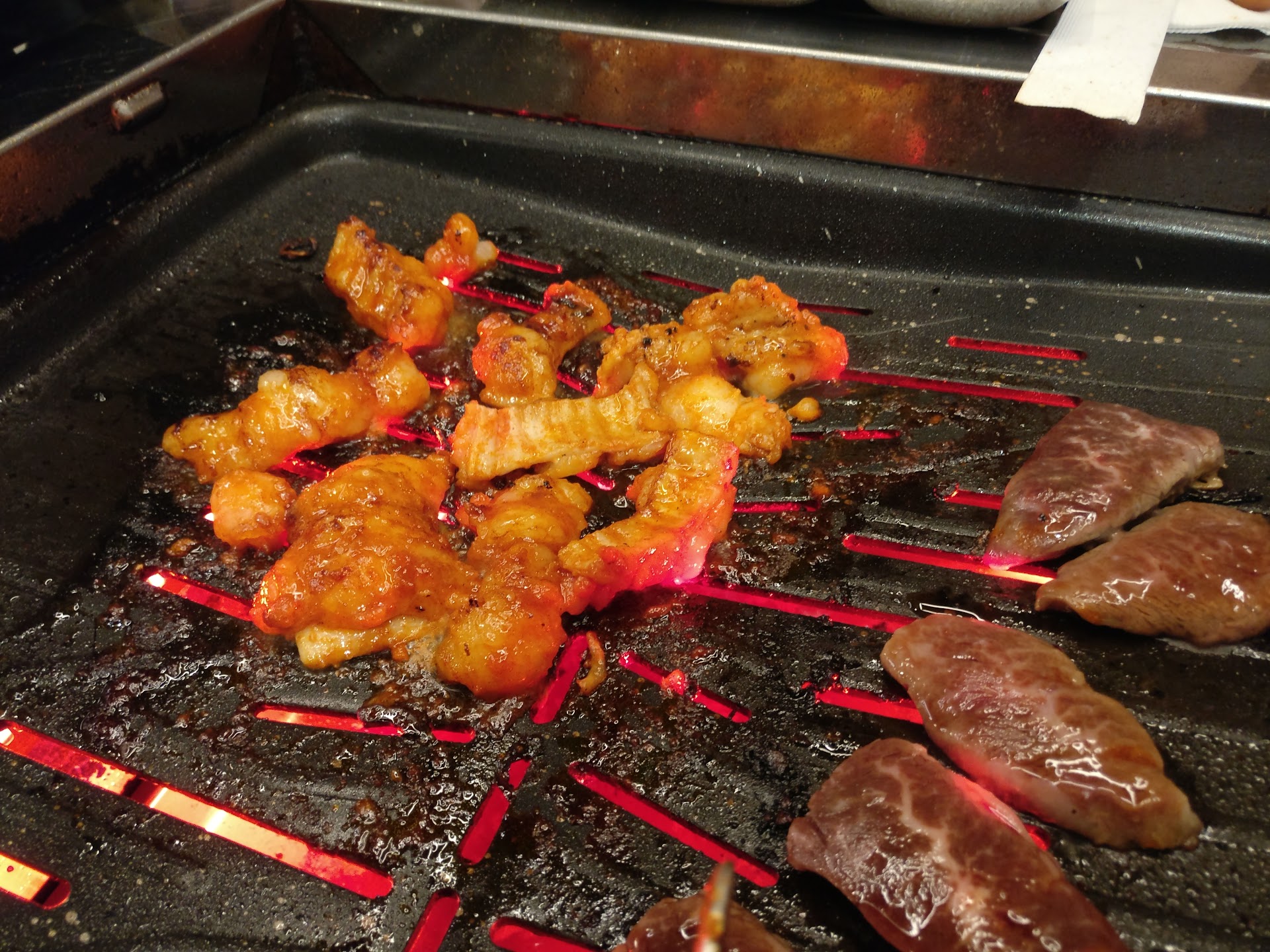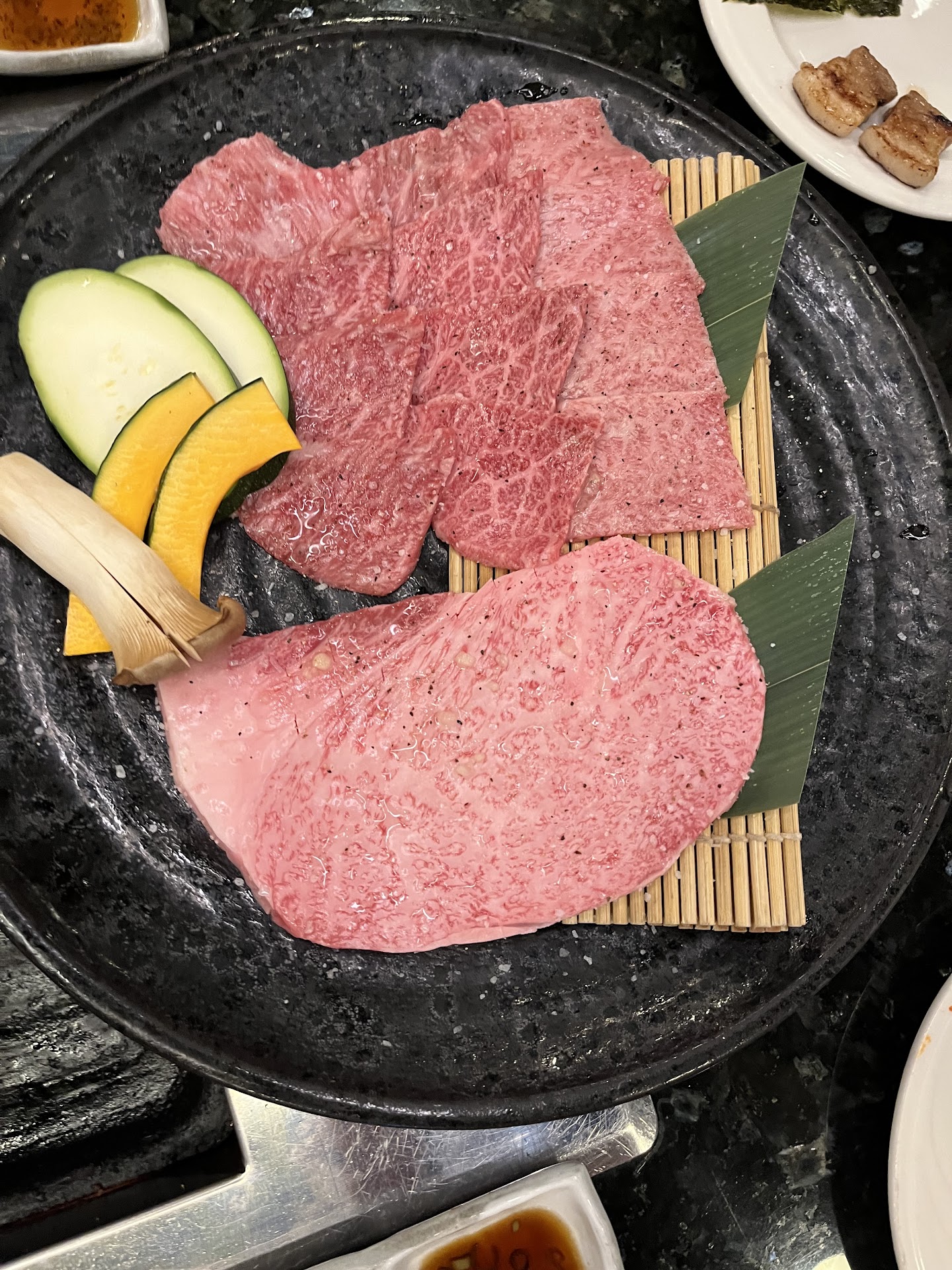 Side note on the grill: you grill your own meat, so you have to carefully balance cooking and eating. Wagyu and Washugyu cook very quickly due to the high fat content, and the thinner cuts will cook extremely fast - the staff advised that thin cuts should be seared for only about 8-10 seconds per side. Tip: don't put too many pieces on the grill at once, otherwise you risk overcooking your beautiful Wagyu! Also, the grill is nonstick so it doesn't have to be replaced; the staff will occasionally wipe it down to keep it clean.