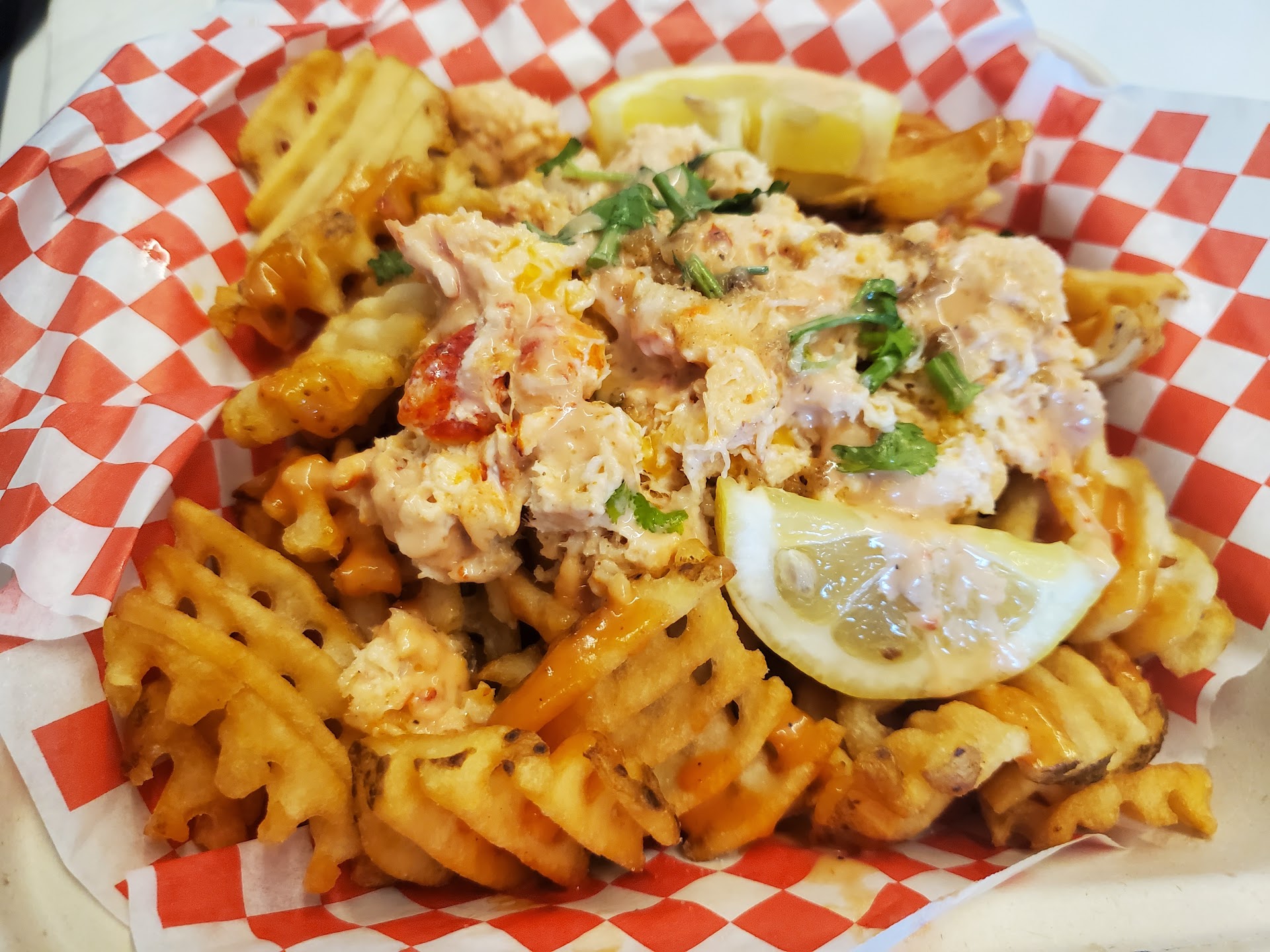Did somebody say "Lobster Fries"?!! Yup! A coworker hipped me to this place, only being a 4 minute walk from the office, so of course I HAD to check it out?! They've got lobster...you name it lol coming in at $20 + $1 for the waffle fry upgrade (a no brainer imo) I walked as fast as I could to get back to the office with them. A pretty hefty serving, they honestly did not skimp on the lobster AT ALL. I was actually pleasantly surprised half way through my plate with how much lobster there really was! I misjudged and ended up eating the fries faster than the lobster topping, or was that just because I was savoring the lobster? Omg, it was good! Came with lemon slices which just put it over the top. Definitely coming back for the lobster fries but more importantly to try other stuff on the menu!