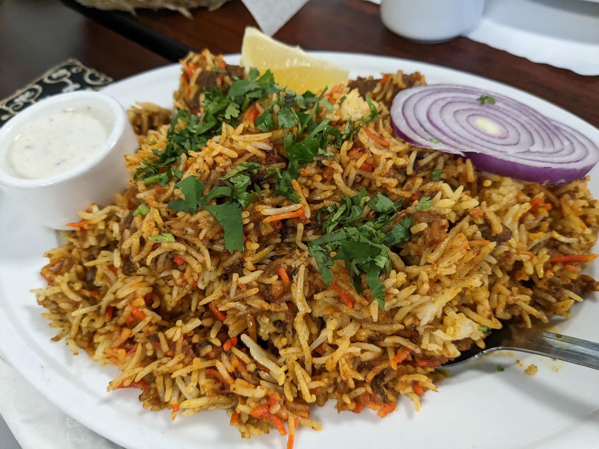 -Saag Paneer (Lunch Special): served on a Thali (compartmental metal tray), generous portions of saag paneer, yellow dal, vegetable curry of the day, achar (Indian pickles), half naan and basmati rice were steaming hot and appetizingly aromatic. It was a good call to order this lunch special to pair it with the biryani as we got to sample more dishes than to have just ordered an additional entrée of saag or curry or mixed grill. After all, it was lunch time and we didn't want to overeat and fall into food coma. $9.99