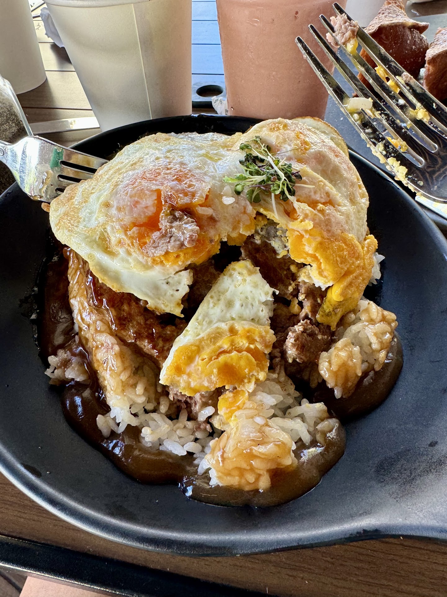 We stopped by on our morning walk around the area to eat there because the menu and place looked nice, and there was outdoor seating. My girlfriend had a drink with her meal, an açaí bowl and mimosa, I had the wagyu loco moco which looked good when I came out. Althoigh the gravy was bland, there wasn’t enough for me to finish this dish so I requested more on the side. The restaurant did not seem terribly busy and for this to take so long was remarkable. When the server forgets about you altogether, it would make you just want to leave. That’s what we decided to do.