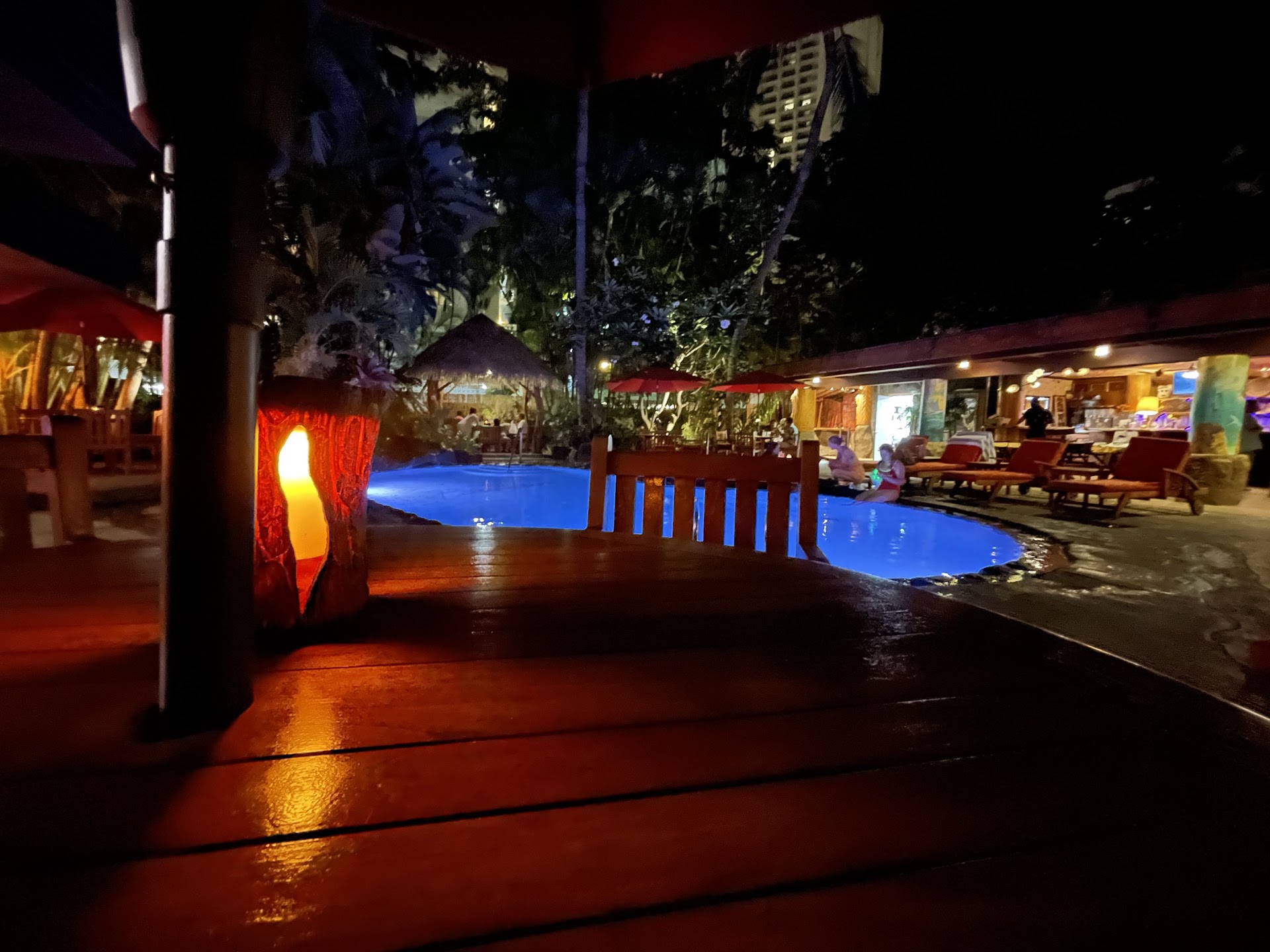 Open courtyard in an older hotel property, it has a lot of charm. Elvis or Don Ho or Sinatra could walk in this place. Pool and hot tub in the middle of the courtyard, diners benefit from the relaxed vibe the hotel guests give off while lounging. Tiki wood, candal festival lights, volcano themed poolside rock work. Cant beat it. And for two plates - $50. A welcome reprieve from the shake-down treatment we’ve gotten everywhere else on Waikiki.