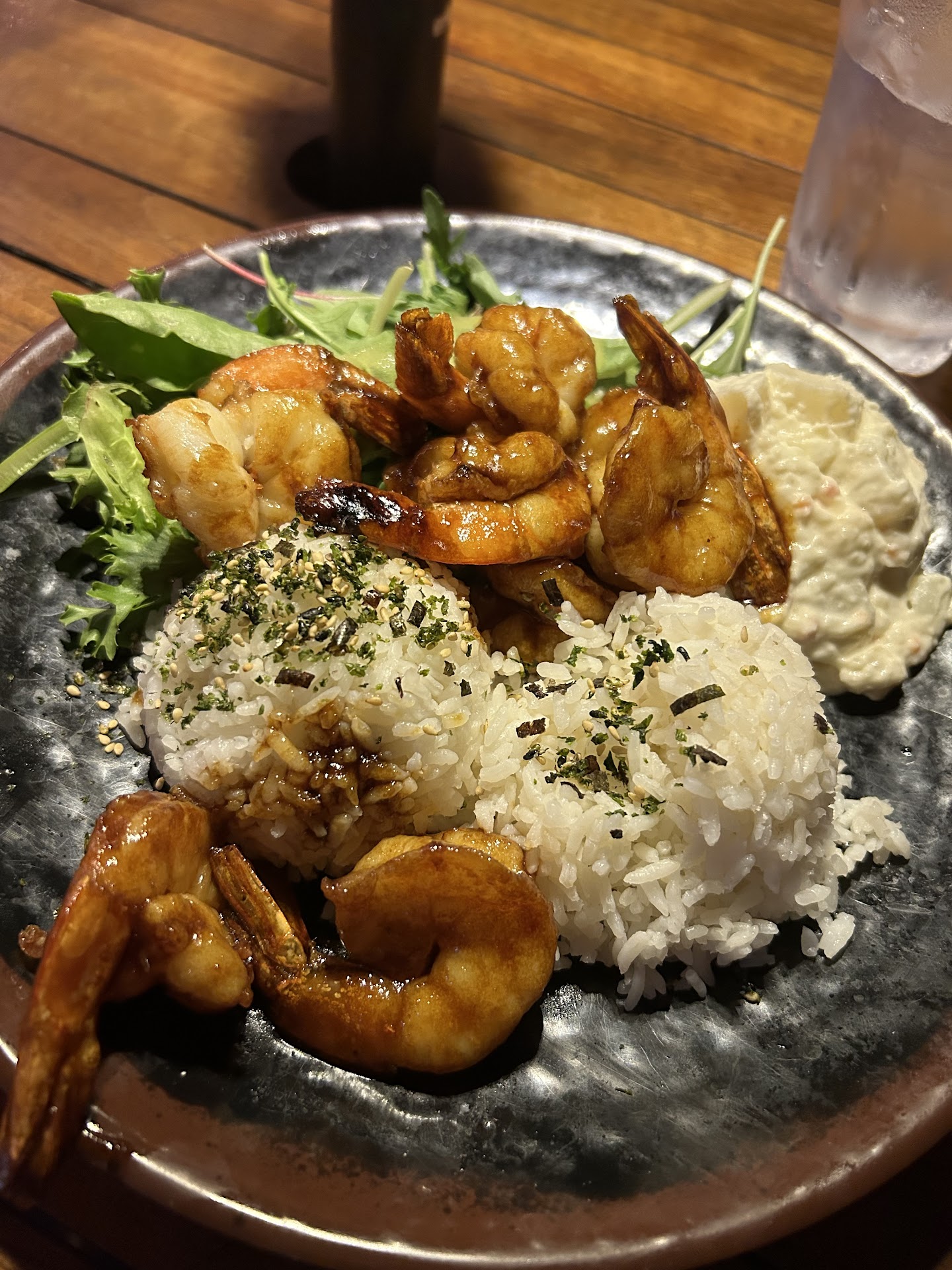 Straight off the busy Kūhiō street into a tiki paradise. A beautiful lava flow fountain feeds the quaint hotel pool while matching “lava” lanterns flicker on your table and throughout the palm trees surrounding this outdoor dining cove. The simple menu (chicken, fresh-caught fish, shrimp, steak or tofu) allows the restaurant to focus on quality and flavor rather than variety. We shared the island fries (a volcano-sized helping of extra shatter crispy unsalted but still flavorful fries) to start then dug into a plate ($20) of 10 or so spicy garlic shrimp (one of sauce options is a delicious, mild hit of extra garlicky chili) with white rice, potato Mac salad and a generous mixed green salad and a bowl ($17) of tropically-dressed mixed greens with a fresh 3-4oz hunk of mahi mahi deliciously seared on top. My only complaint was the matsuri sauce (another sauce option) was a bit heavy handed on the fish and mayonnaise-y (I could have done without completely the fish was so good).