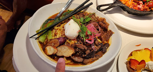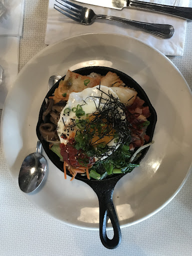 Breakfast Bibimbap Wow, this was so ono! The soft and crunchy garlic rice at the bottom of the cast iron pan went well with the cornucopia of toppings and flavors (ong choy, mild-spiced kim chee, bold kim chee paste, shiitake mushrooms, bacon, ham, Portuguese sausage, over easy egg, carrots, bean sprouts, nori and green onions). You'd normally mix everything up before consuming bibimbap, but I'm a patient eater so I took a little bit of everything at each bite. Highly recommended.