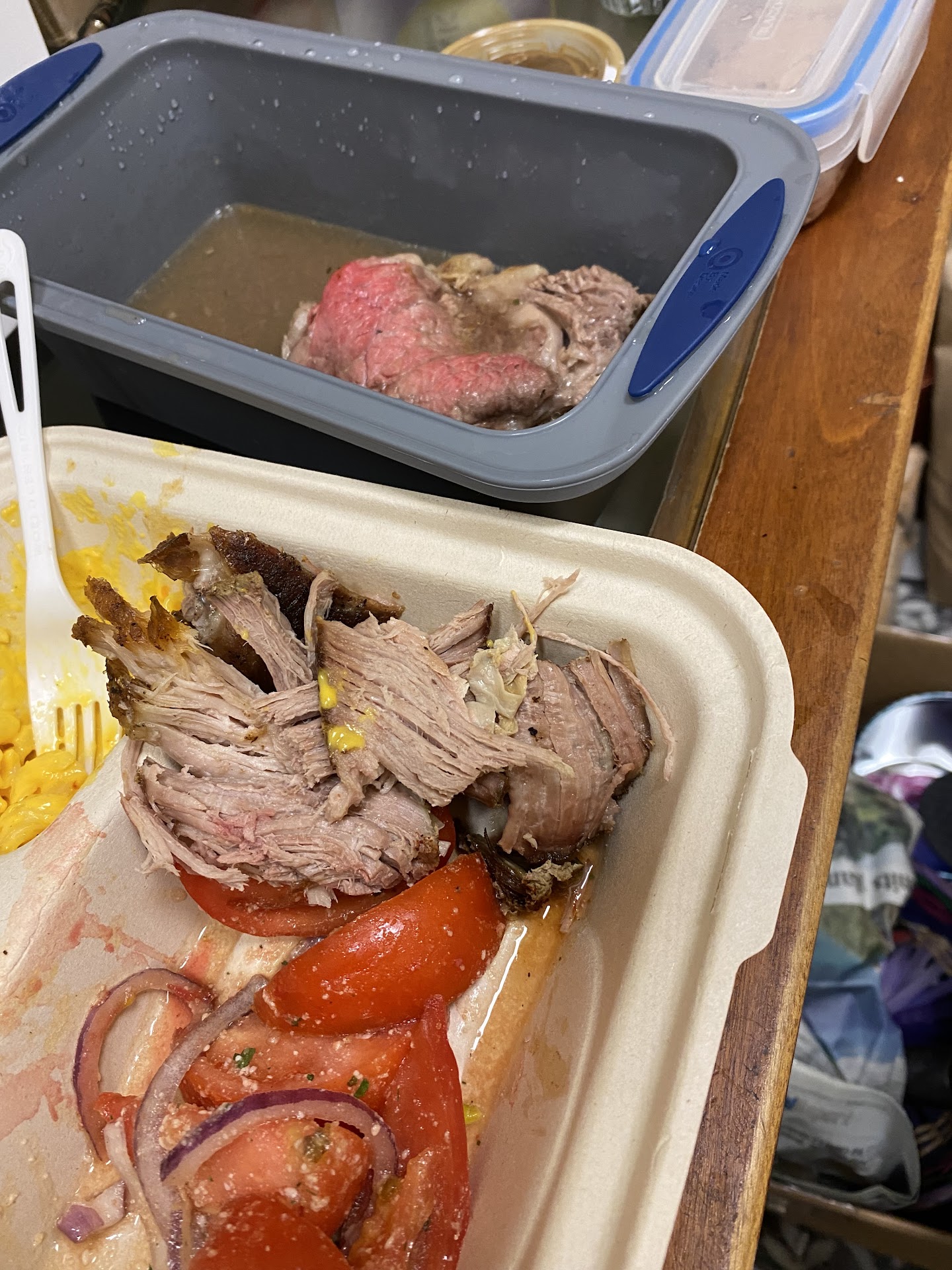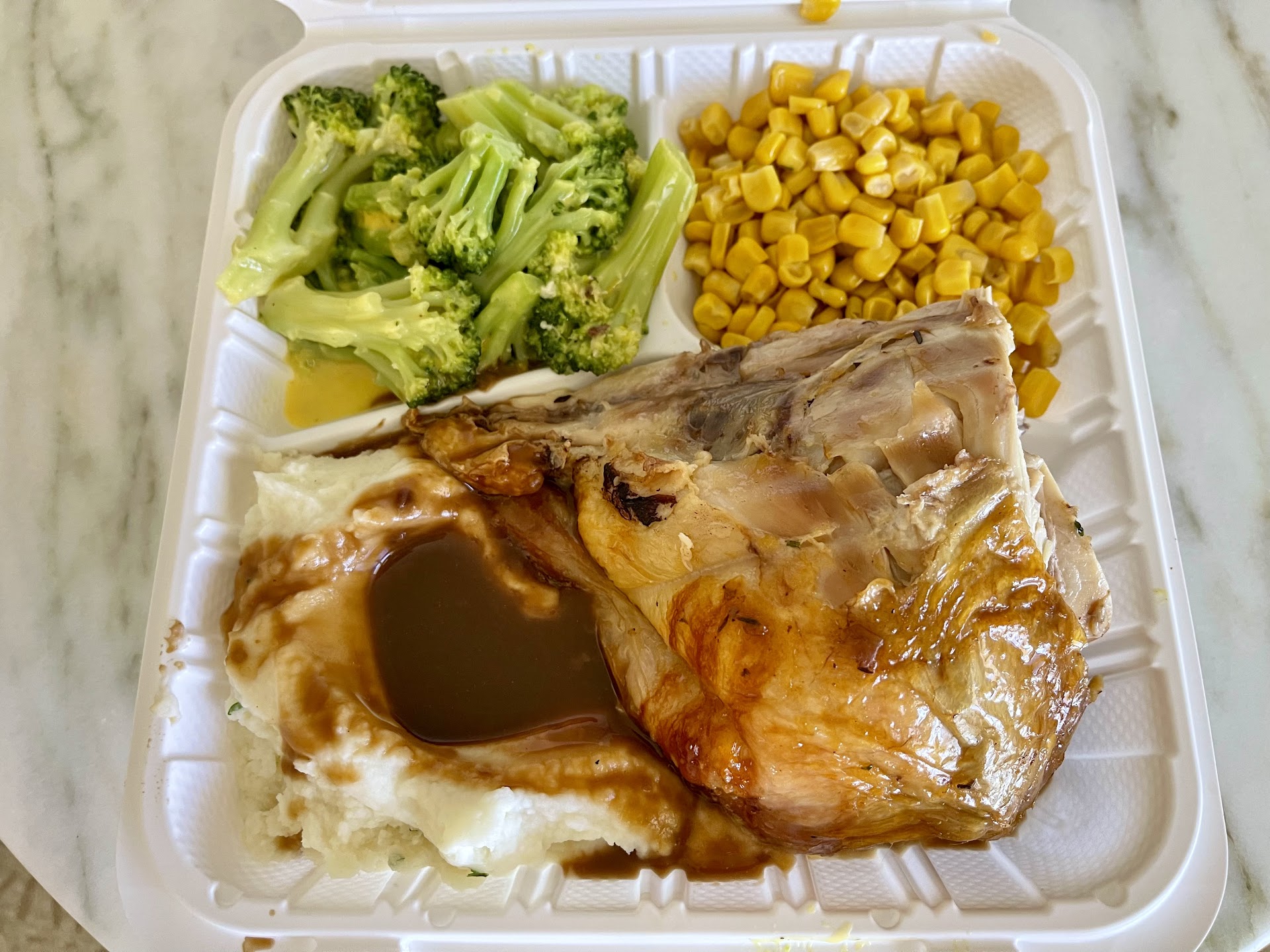 FOOD: 3-Item Plate I chose roasted chicken (dark meat), buttered corn, mashed potatoes with gravy and broccoli in a light cheesey-creamy sauce. The 1/4 piece of chicken was tender, juicy and good-sized. I detected a light truffle flavor on the skin which was still palatable to me. I couldn’t finish all of the broccoli as the sauce was too overwhelming.
