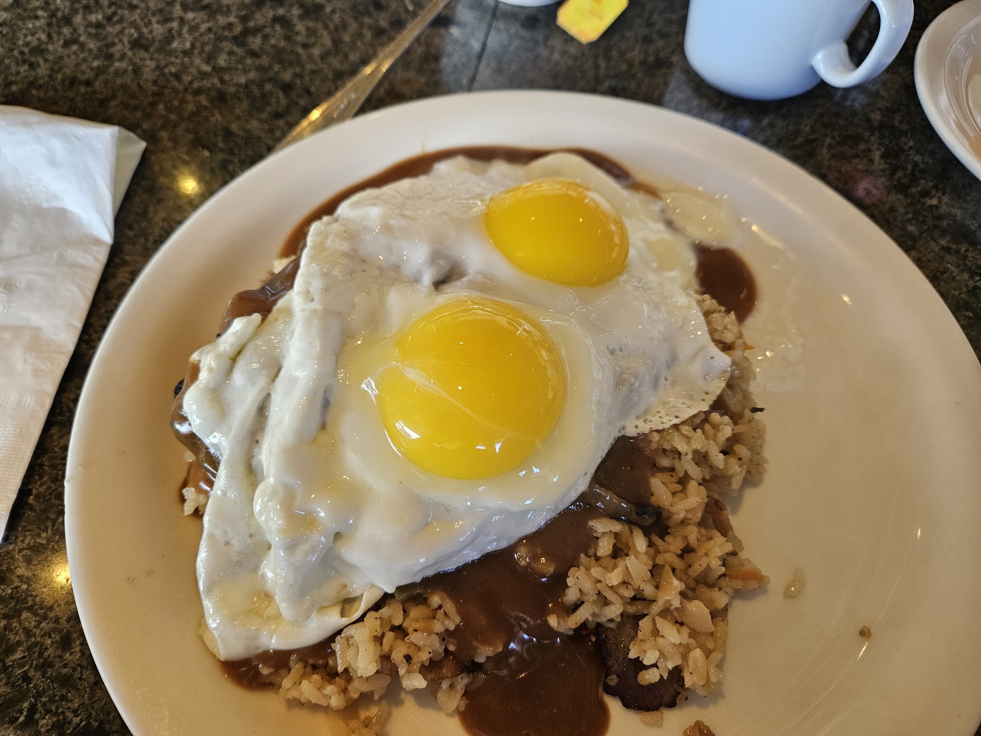 Loco moco with egg 10/10 the gravy was bomb, about of rice was great! Nice char burger meat, perfectly seasoned ! Perfect plate, and would definitely order again!
