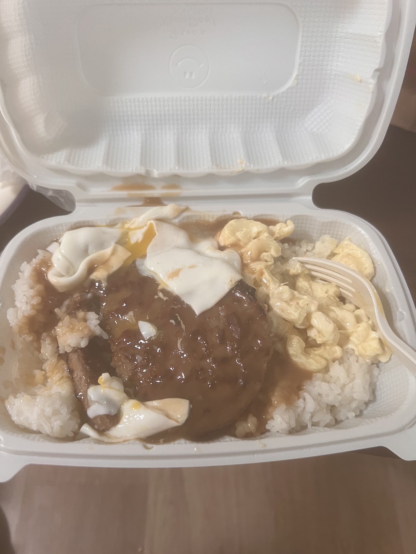 Anyways, on to the actual food. Unlike the order description, this only came with 1 egg and 1 hamburger steak, outstanding. Must be because I ordered the default mini size... Nice play on words but whatever. I never complain about the portion of rice, there was about 500 grams worth, so very nice! I am very peculiar about rice, this wasn't burned or kept heated too long, or long grained rice prepared like short grained rice, it was fresh and delicious. Only reason this isn't 1 star. The egg however, I ordered over medium, and it came out completely wet and undercooked. Much more undercooked than over easy, messy goop of an egg. Whatever, I still ate it just to try it out. Over all bland egg. The hamburger steak was actually just a hamburger patty.... Over all terribly cooked, blank, and no seasoning. The gravy made this entire dish edible. Rant over.