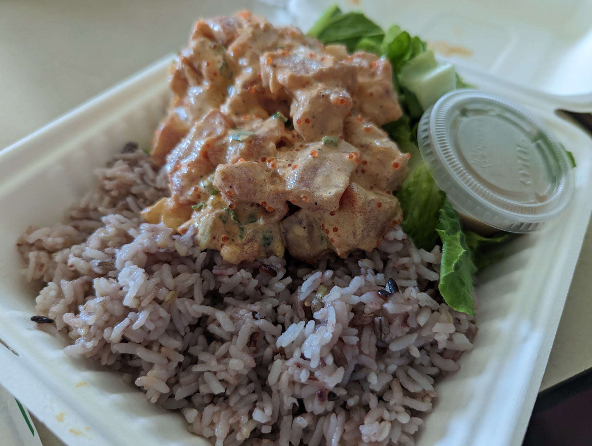 The shop is small since it's a grab and go. During lunch time I saw a lot of people keep coming in, fortunately there wasn't a line when I went. The cashier was pretty efficient and still friendly, greeting people with aloha. The shop was also clean. No seating inside but there's plenty outside in the plaza.