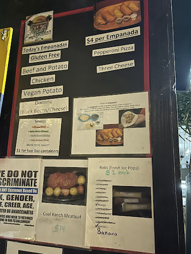 The menu of empenadas available changes daily. He opens at night and tends to sell out. If you ask "whats good?", Alex will inform you that "It doesn't matter, it's all good... What are you in the mood for?"
