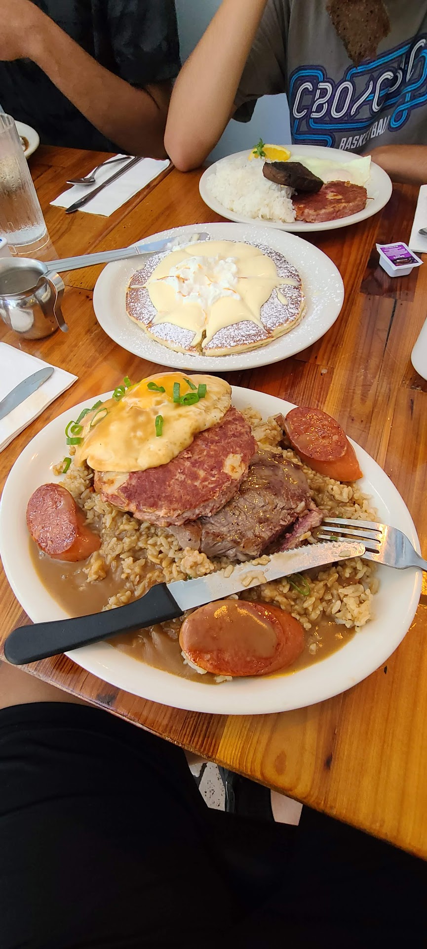 Upon returning to the restaurant, I found myself face-to-face with the pièce de résistance: the Big Kat—a secret menu item that dared to challenge even the most audacious of brunch enthusiasts. It was a dish that looked like it could feed an army of people. Two eggs over corned beef hash over ribeye steak, nestled atop a bed of fried rice and smothered in rich gravy, with Portuguese sausage on the side—it was a veritable feast for a king.