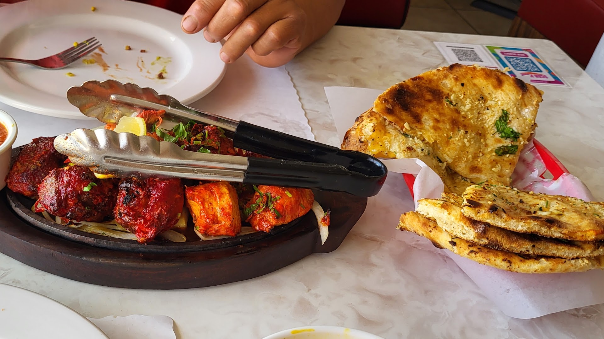 We started with drinks, a sweet lassi for me and a mango lassi for my girlfriend. Both were creamy, refreshing, and the perfect way to kick things off. For food, we ordered two garlic cheese naans, chicken tikka masala, and lamb curry. Everything came out quickly, piping hot, and packed with flavor. The naan was soft and cheesy, the chicken tikka masala was rich and perfectly spiced, and the lamb curry was tender with just the right amount of heat. You could really taste the quality in every dish.
