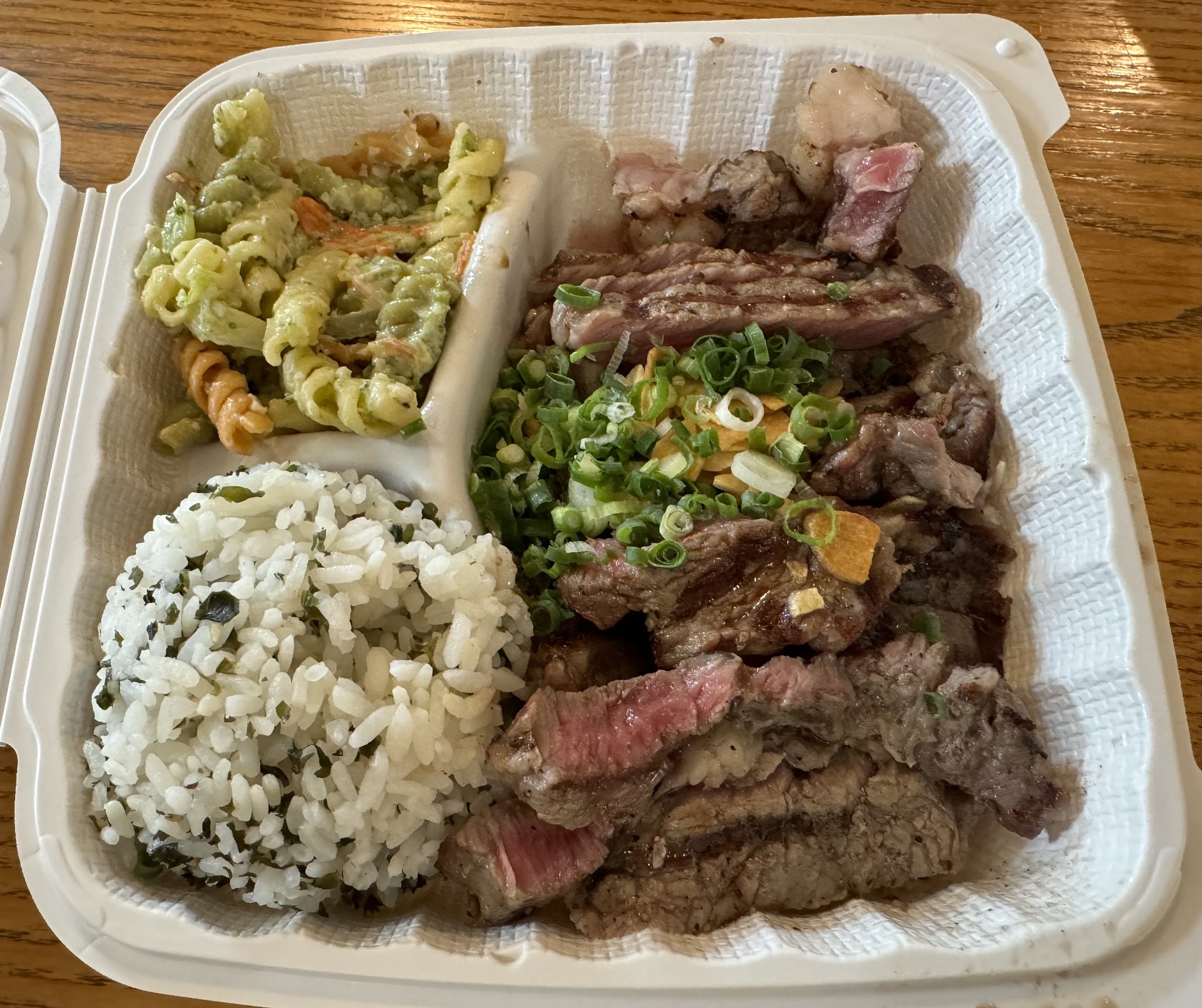 Read moreWould Not Go Again. Every thing looks good, but that's about it. The taste did not match the looks. The mochiko chicken was over cooked and didn't have any of the sweetness that it should have had, not even a hint. Mochiko is sweet and some sugar should also be added but it really didn't taste like anything besides shoyu (soy sauce). The Grilled Chicken with wasabi was completely unseasoned grilled chicken with a container of shoyu with a tiny bit of wasabi in it. So, just plain chicken and shoyu. Sensing a theme? Plain old shoyu. The Garlic Ahi Steak was the same, Ahi with a bunch of sliced garlic on top and a whole lot of shoyu. The piece of Ahi itself was very nice, but overall it just tasted like Ahi with garlic and shoyu. Plate lunch in Hawai'i is a staple and based on what we had today I don't see how this place stays open. There are SO MANY BETTER places that even give more. For $10+ I expect more than 1 scoop of rice and potato salad (which by the way was the best thing we had). Even if this place was in Oregon (where we live now) I wouldn't go. My friend's haole boyfriend from Oregon cooks better local food than this place. It's not horrible but it definitely didn't come close to living up...