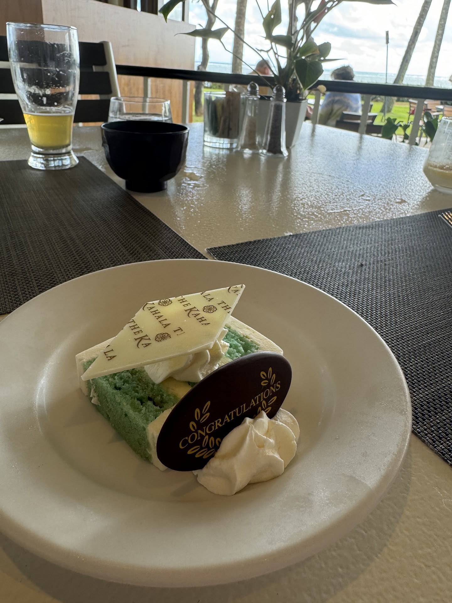Food: The Fried Ahi Poke Musubi was out of this world - huge and probably too much for just 2 people but we ate it anyway! It was the perfect marriage of crispy rice, seasoned tuna and umami seaweed... you HAVE to try it if it's on the menu! Hubby got the The Kahala Burger and said it was Top 3 of the best burgers he's ever had (and he's had a lot!). I tried the Crispy Wok Fried Prawns with Chicken-Fat rice. Both were great, but the prawns were best! I was also SUPER IMPRESSED and thankful that Plumeria Beach House took the time to designate the items on their menu that were dairy-free, egg-free, and gluten-free. That is such a thoughtful detail and as a guest who is dairy-free, I appreciated knowing up front what my food options were. Bravo and kudos to whomever decided to do the menu that way.
