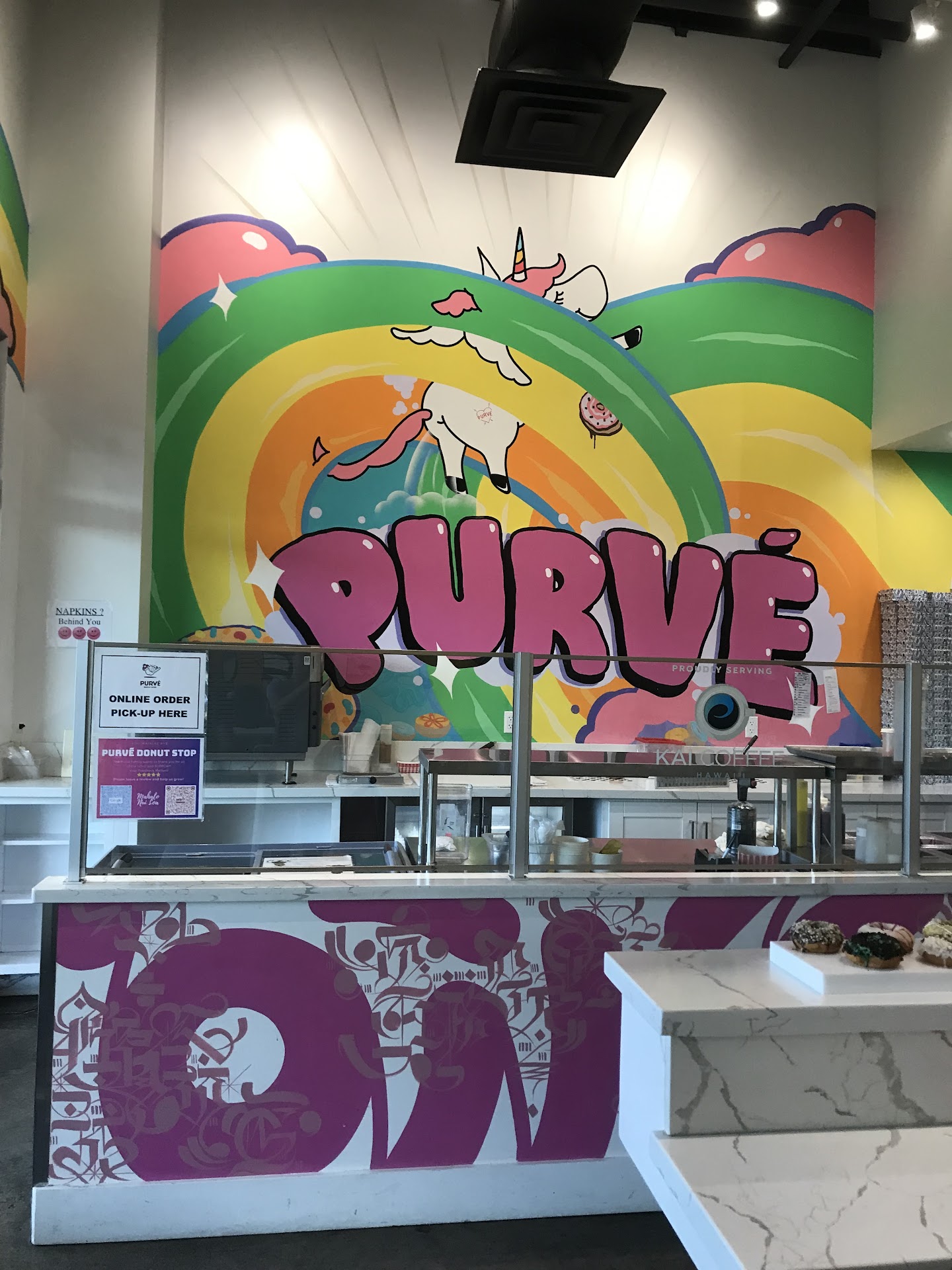 Read moreSummer time is always a challenge of how to entertain children. This place was perfect. We are early risers, so when we found out they opened at 6:00AM we were thrilled! We have been here before, but it was really quick and the kids were too young. Now, they are much older, entertaining with amazing unicorn artwork and great, local iced coffee is just what a mother needs. We were greeted by Blaise and Brion right away. Sorry if I messed up the names. They explained how to order the donuts and made recommendations. Kids usually know what they want, but sometimes they are attracted to the look more than the taste. Good news is that they have a custom menu on the back of the menu if your child only likes chocolate. I got the plain, which is nostalgic of me watching a movie about freshly made plain donuts as a kid. Brion also gave us a free donut that tasted like a malasada! He even visited our table to give free unicorn stickers to our children. I really liked the unicorn butt exit sign. Switching gears as a hardworking parent or stay-at-home parent can be a challenge in the summer, so we are glad that purve set the atmosphere with yummy donuts and excellent...