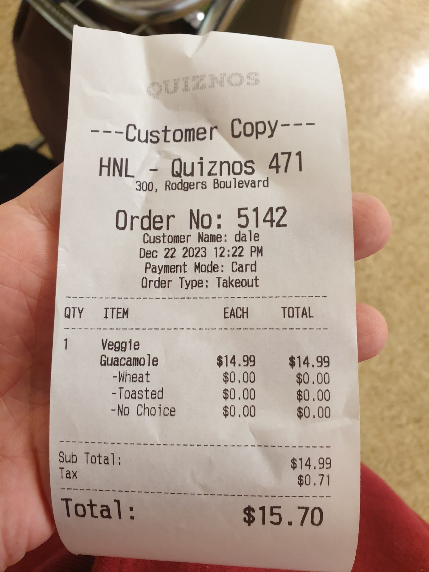The only quiznos I can find in Hawaii. You need to either be in the wing of the airport that has it, or have a long time before your flight to reach it. Automated ordering screen but the sandwiches are just as good as I remember for toasted subs. Much better...