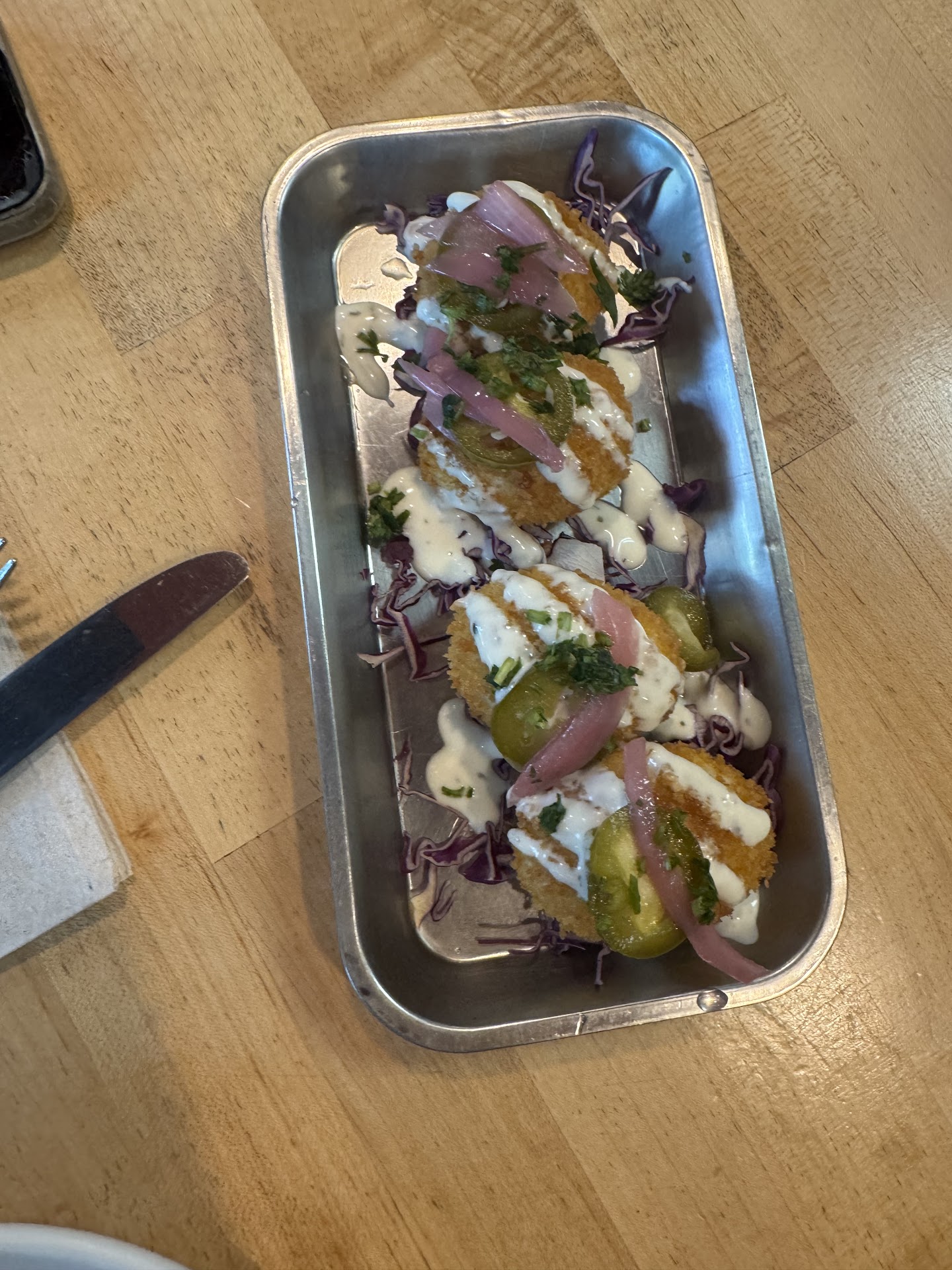 Deep Fried Deviled Eggs – $12 Crisp and satisfying, the deep-fried deviled eggs immediately impress with a sweet, lemon-zesty sauce. I’m unsure if it's pickled radish— but if it is— it adds a bright, acidic contrast, while the subtle heat from the jalapeño beautifully enhances the dish’s sweetness. A lively starter with balanced complexity. 8/10